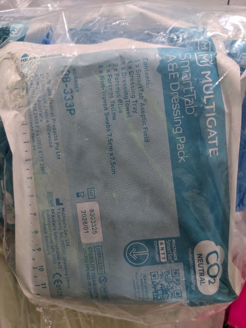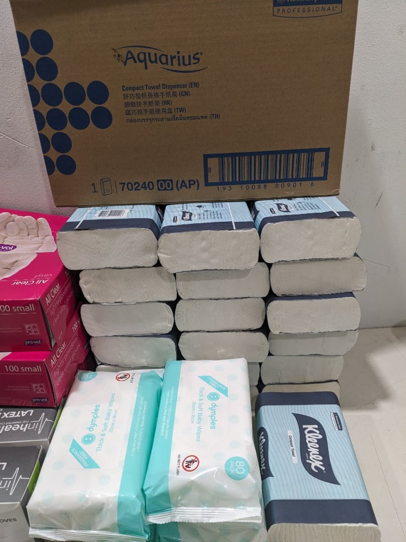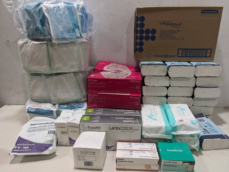 Personal Protective Equipment - New latex and vinyl gloves, dressing pack basic sterile, baby wipes, paper towel and more.