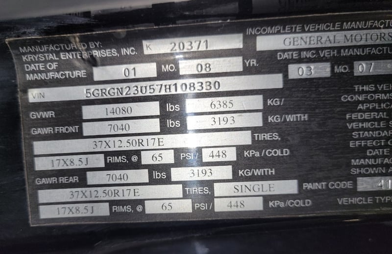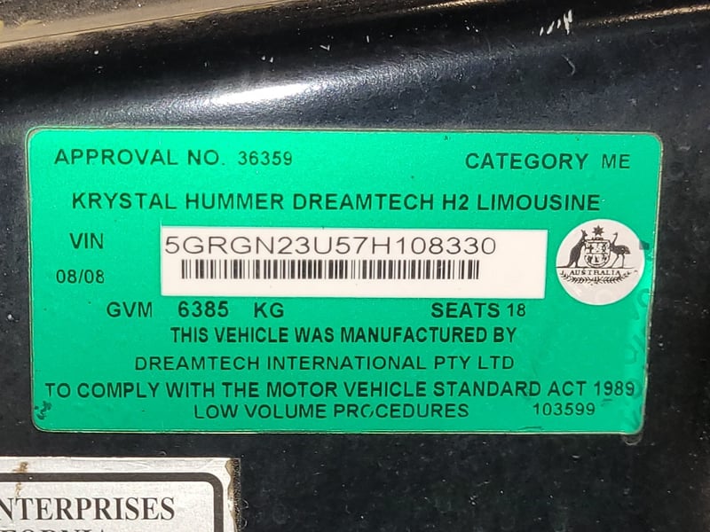 2008 Hummer H2 Heavy Omnibus Year: 2008 Make: Hummer Model: H2 Series: Heavy Omnibus Body: Bus Drive Type: Four-wheel drive Odometer: Indicating 210,341 Kilometres Colour: Purple Description/extras: Power windows, Leather interior, Central locking. Isolator. No Aircon in Front Cabin, Marks and Scratches. VIN: 5GRGN23U57H108330 ENG No: 57H108330 (Key #PCV8) Lloyd's stock #153800+1 For more information please contact: Nektarious - 0477237839 [email protected]