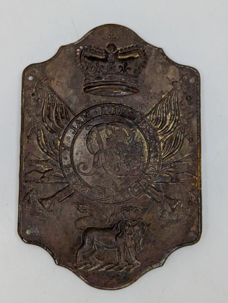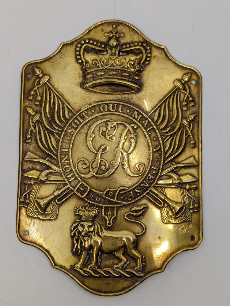 This Large Plate Belongs To The Late 18Th-Century/Early Napoleonic Era, Worn On The Early Shako Or Cap By Infantry During Britain’S Wars With Revolutionary France. A Crowned “Gr” Cypher Or Similar Device Proclaimed Loyalty To George Iii While Regimental Numbers And Wreaths Began To Standardise Identity.
