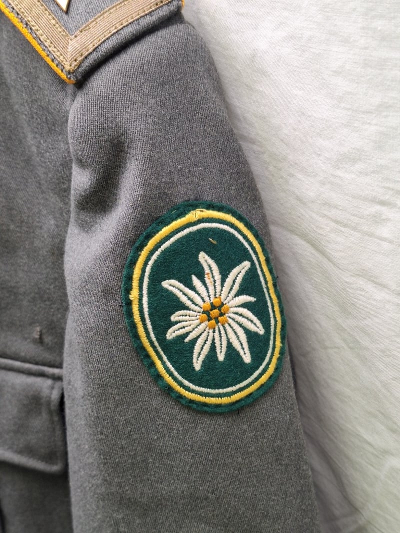 Early 1950S Type Brass Rank On Epaulettes (Long Service Individual). Loops For Ribbon Bar Alpine Troops Badge To Left Sleeve (Was Loose & Since Reattached) Minor Nips & Has Seen Use, But A Scarce Tunic