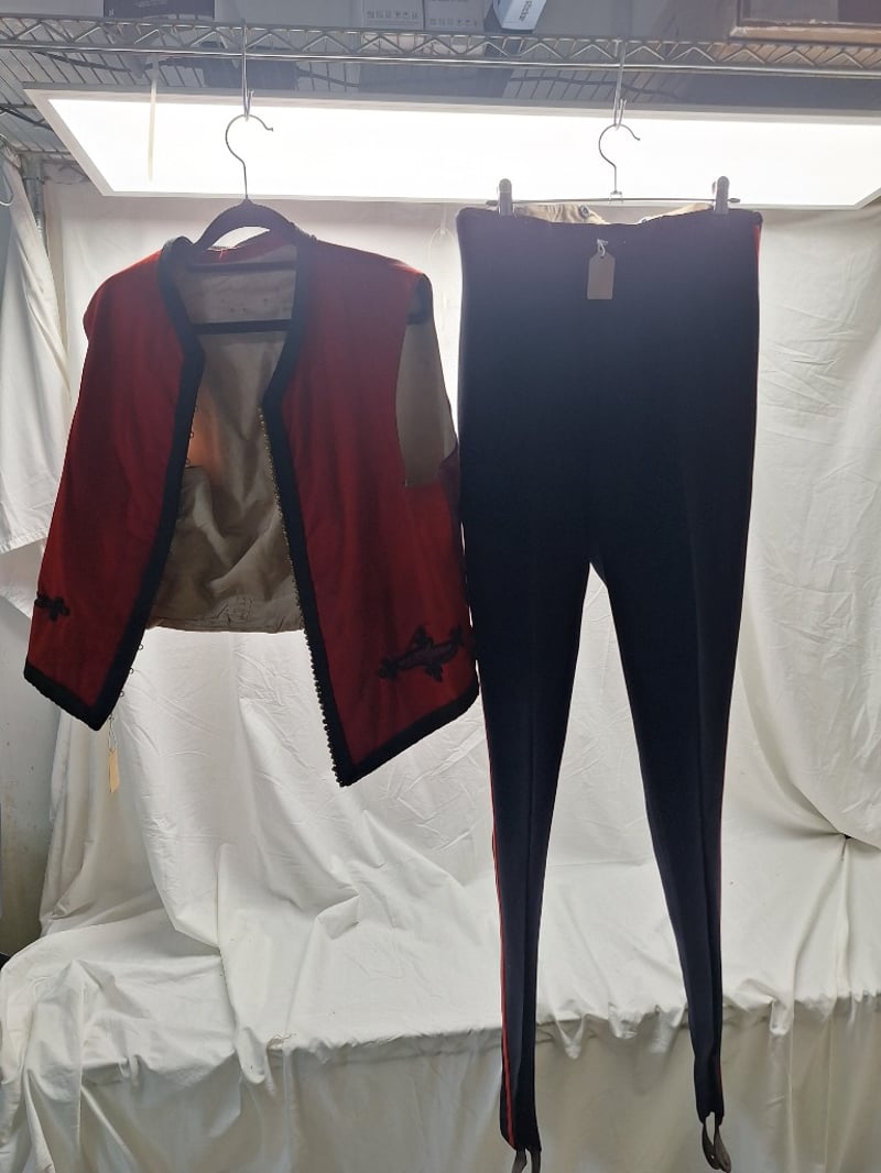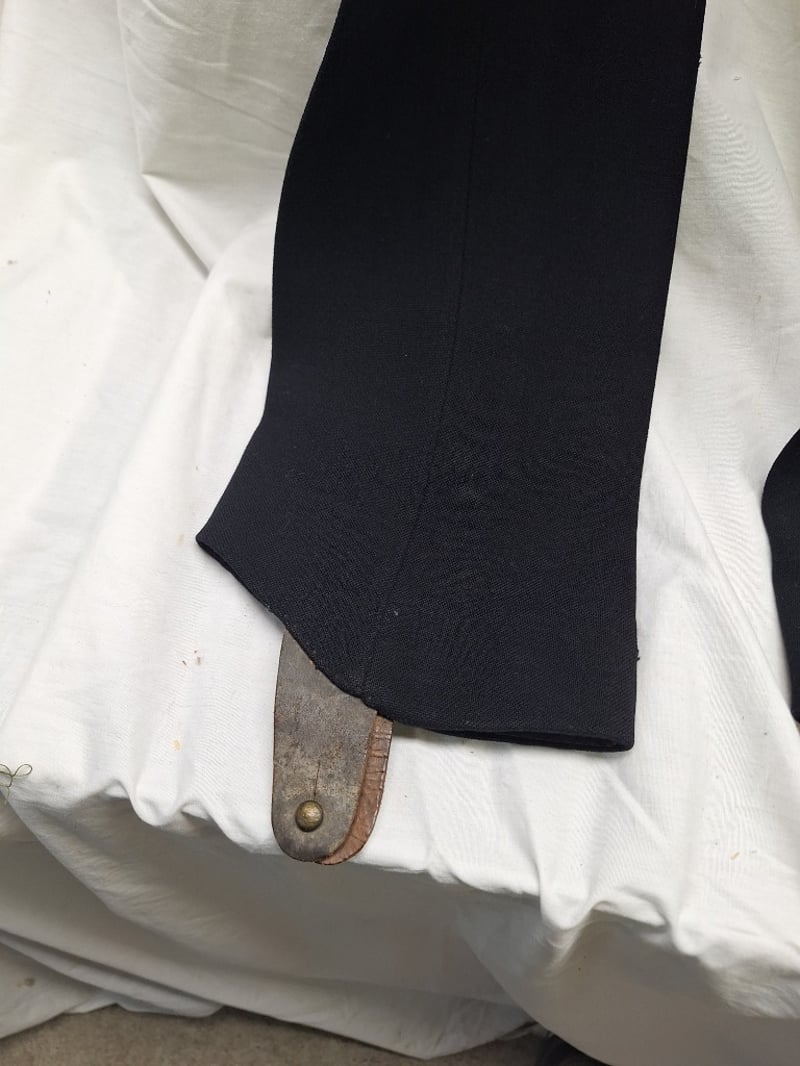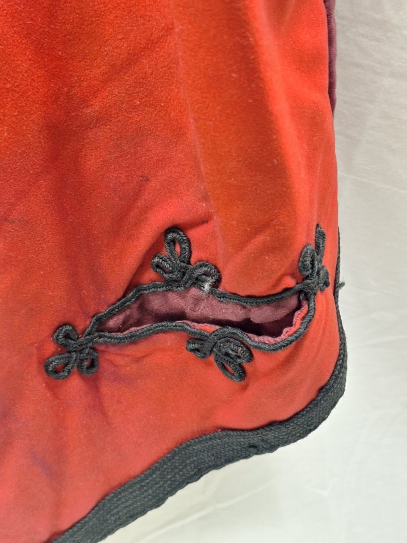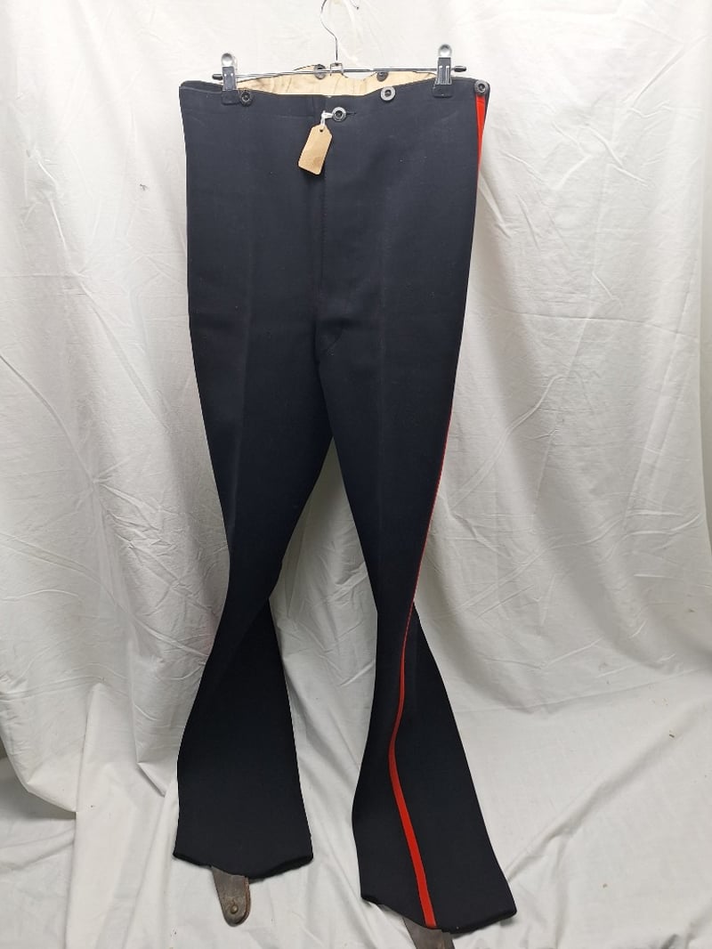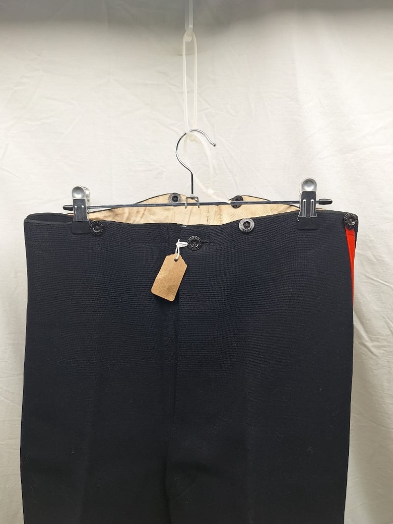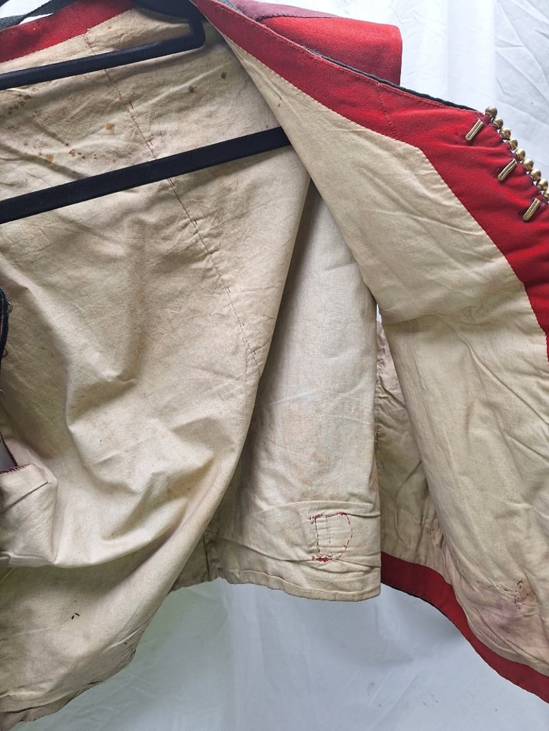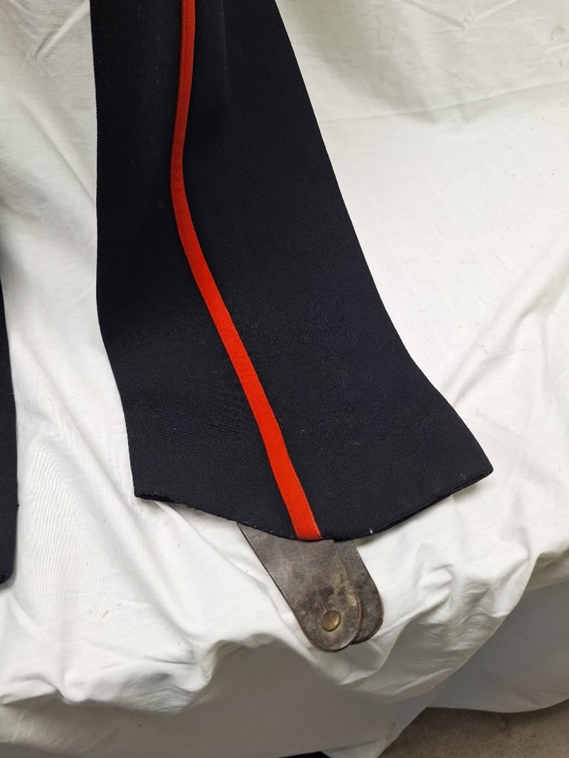 Heavy Red Cloth With Black Mohair Decorations. Some Mohair Loose. Complete With A Pair Of British Infantry Officers Pattern Victorian-Edwardian Oxford Mix Trousers. Dark Blue With Thin Red Welt, Used By Infantry. Made By Hawker & Co. Leather Stripes On Base