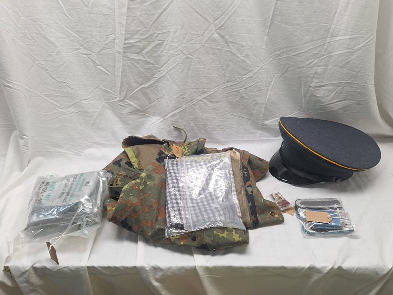 West German Airforce Ors Peaked Cap. No Badge. Size 60 (Xxl), Dieting Neck Scarf. Pattern Relates To The Viewing Units Operating In The Making Delta. German 1990S Hooded Flecktar Came Jacket Medium-Large East German/Ddr Insignia Two Pair Of Airforce Officers Epaulette, Nva Epaulette, Five Service Cap Badge & A Pair Of Navy Ors Collar Tabs. Set Of Three Czech/East German Sealed M10M Gas Mask Filters