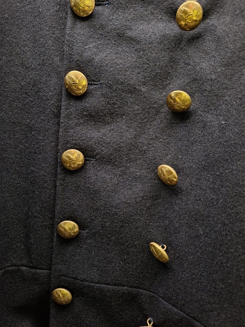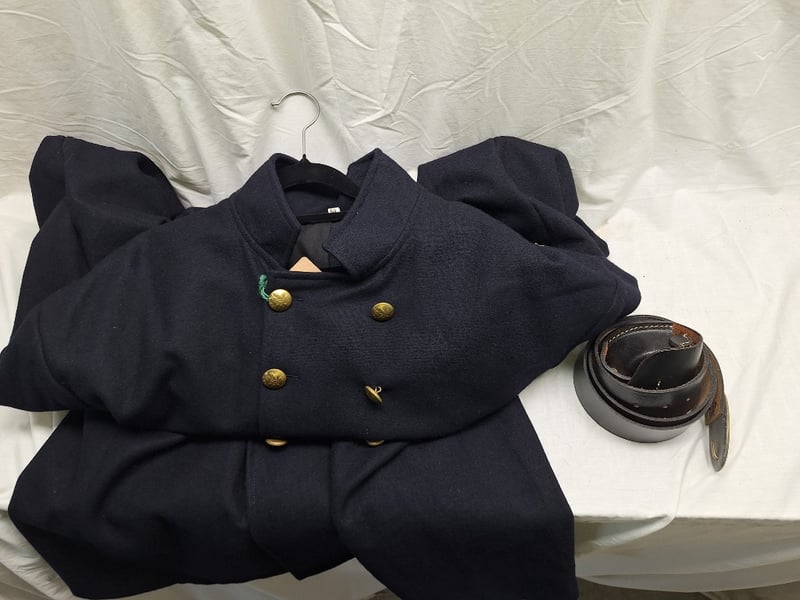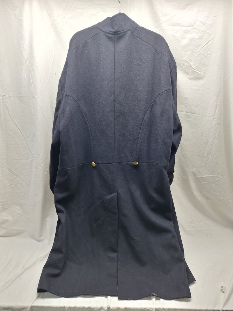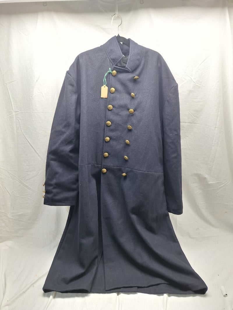 Double Breasted Flocked Coat. Blue Wool, Brass, Eagle Buttoms, Xxl Size 50. Reproduction Leather Us Civil War Black Leather Belt With The Georgia State Seal Bucket (Xxl Belt) And Black Leather Cap Pouch