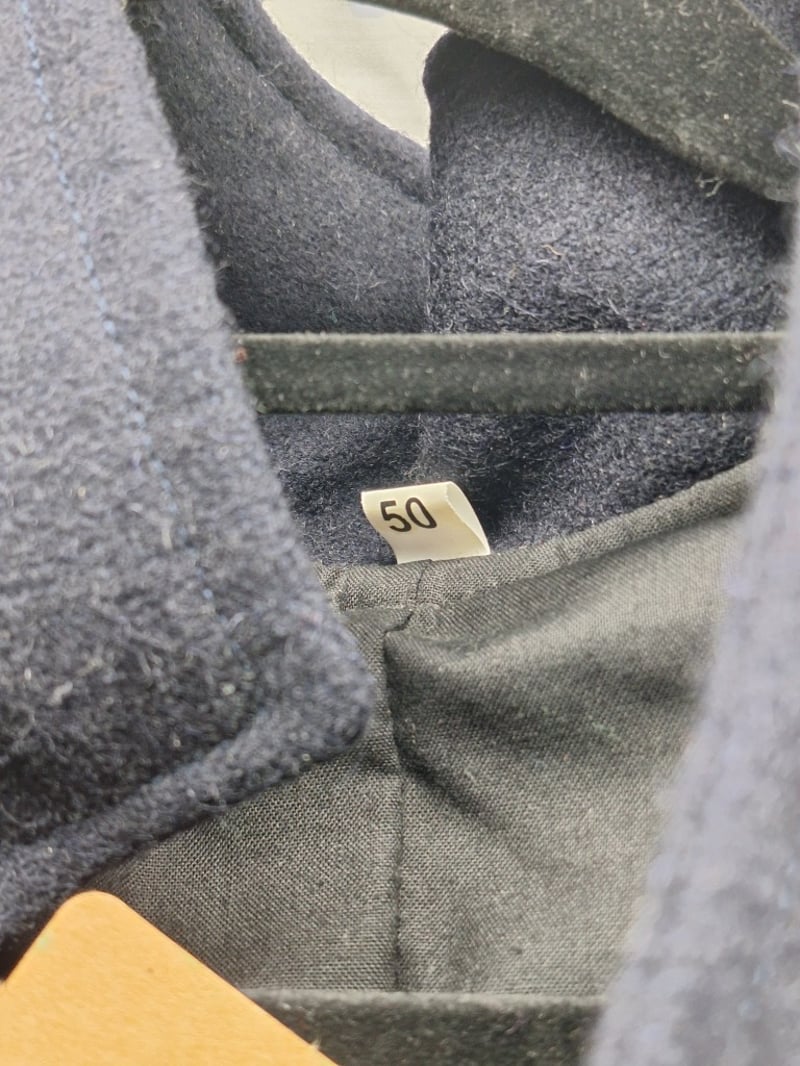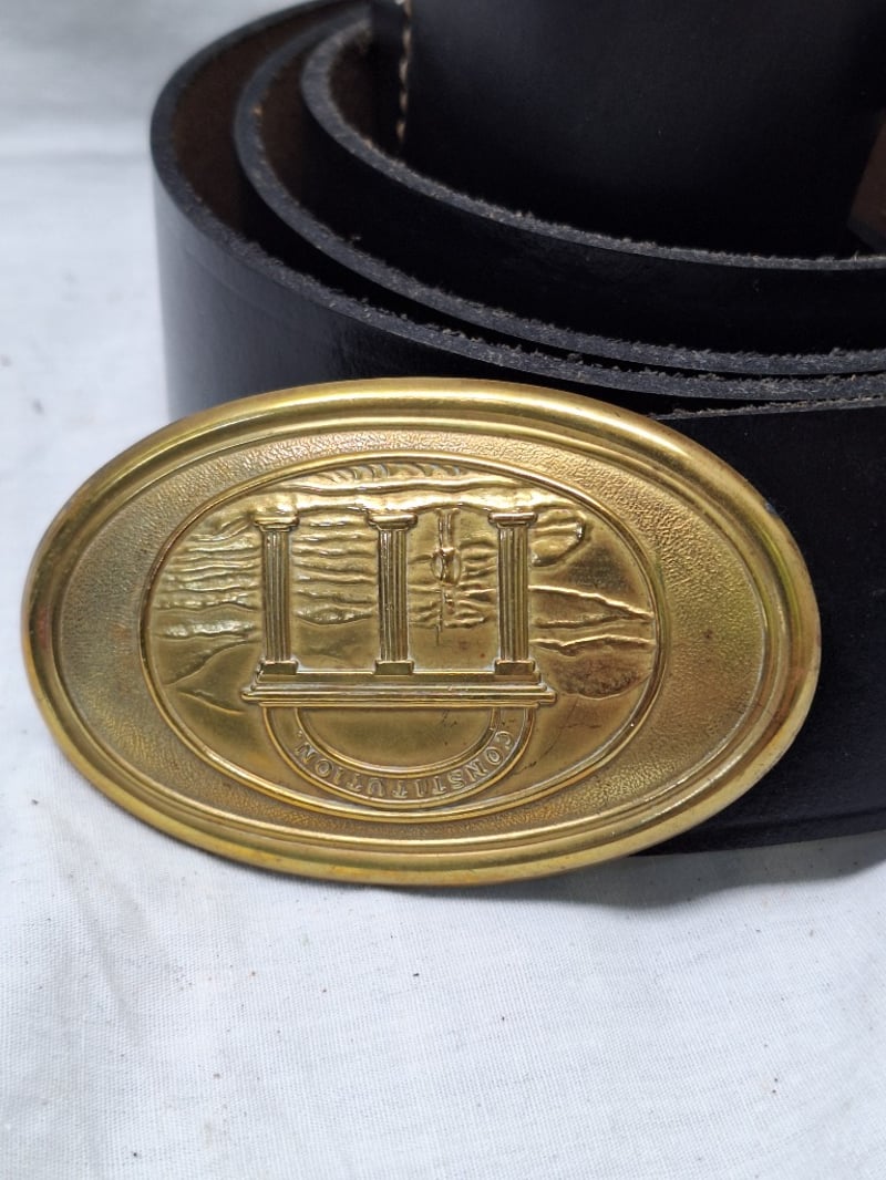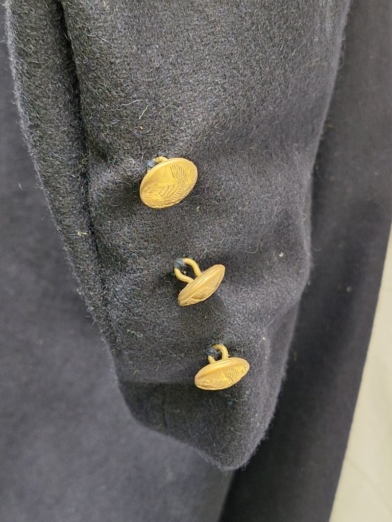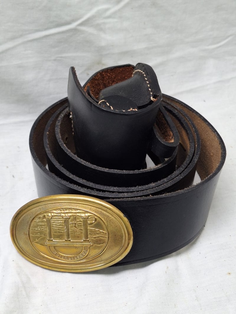 Double Breasted Flocked Coat. Blue Wool, Brass, Eagle Buttoms, Xxl Size 50. Reproduction Leather Us Civil War Black Leather Belt With The Georgia State Seal Bucket (Xxl Belt) And Black Leather Cap Pouch