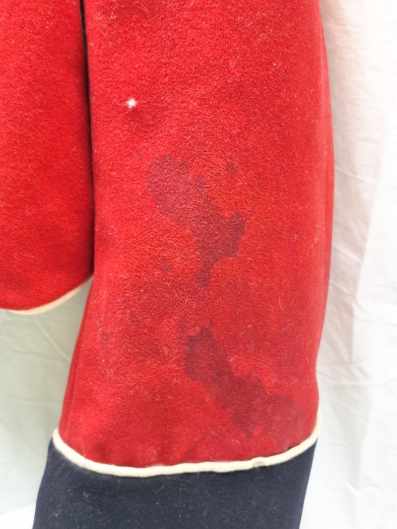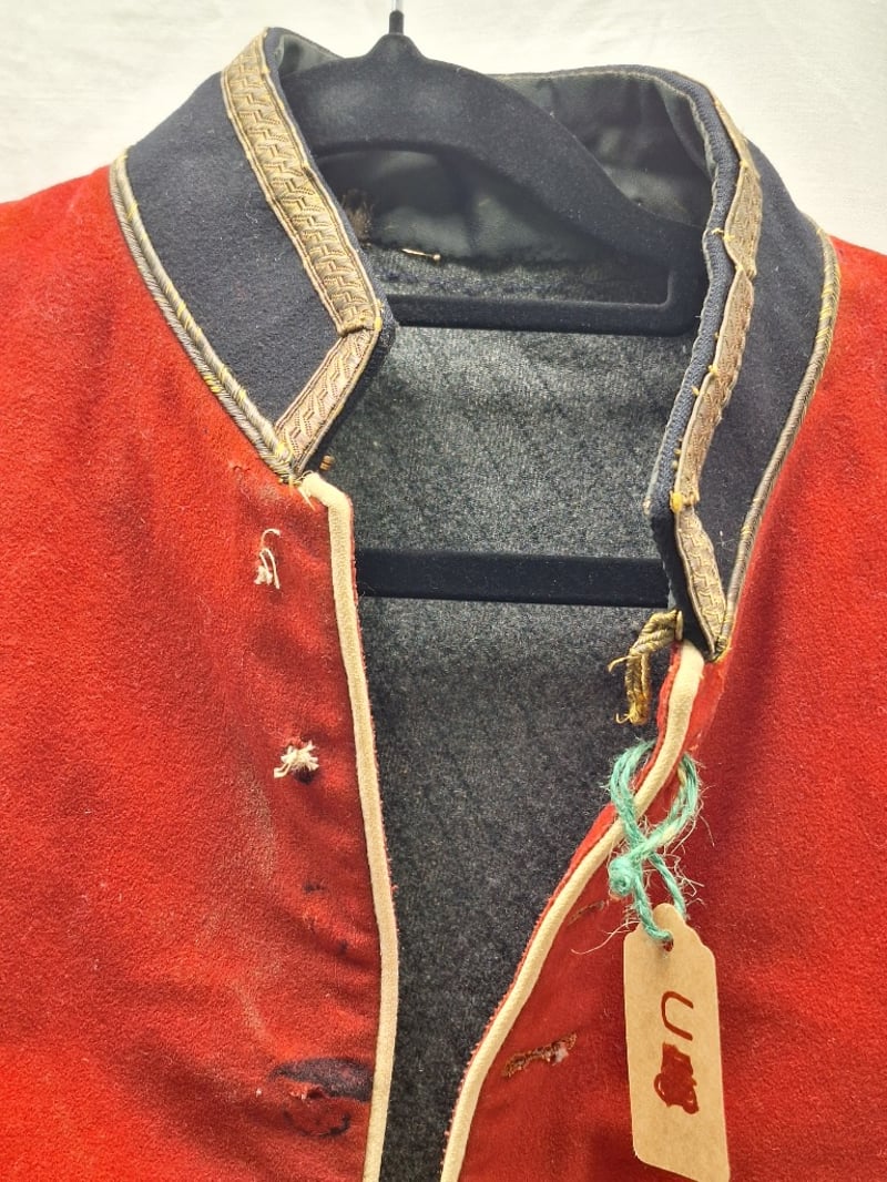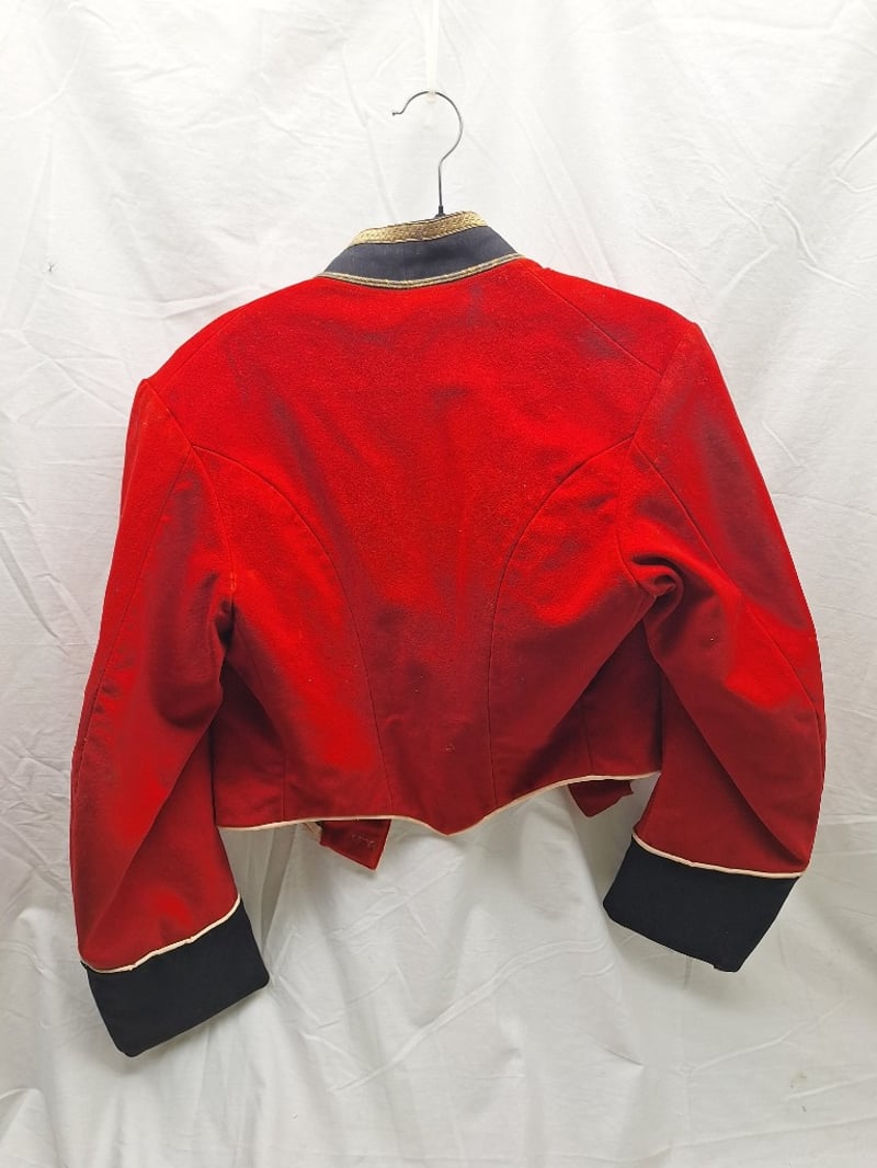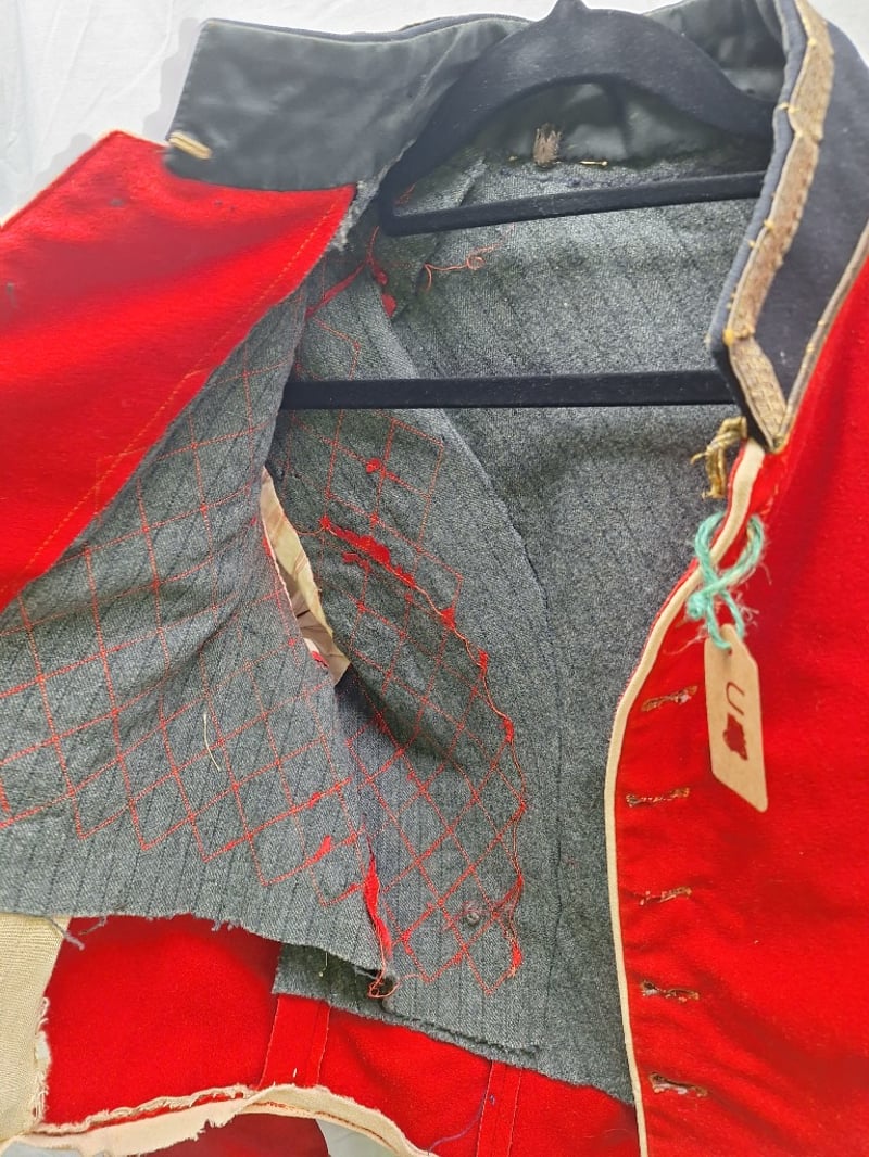 British/Colonial Officers Red Shell Jacket. Blue Facings, Gilt Bullion Trim To Collar. No Buttons Or Lining. Some Stains. Complete British Infantry Pattern Victorian-Edwardian Oxford Mix Trousers. Dark Blue With Thin Red Welt, Used By Infantry. Made By Hobson & Sons.