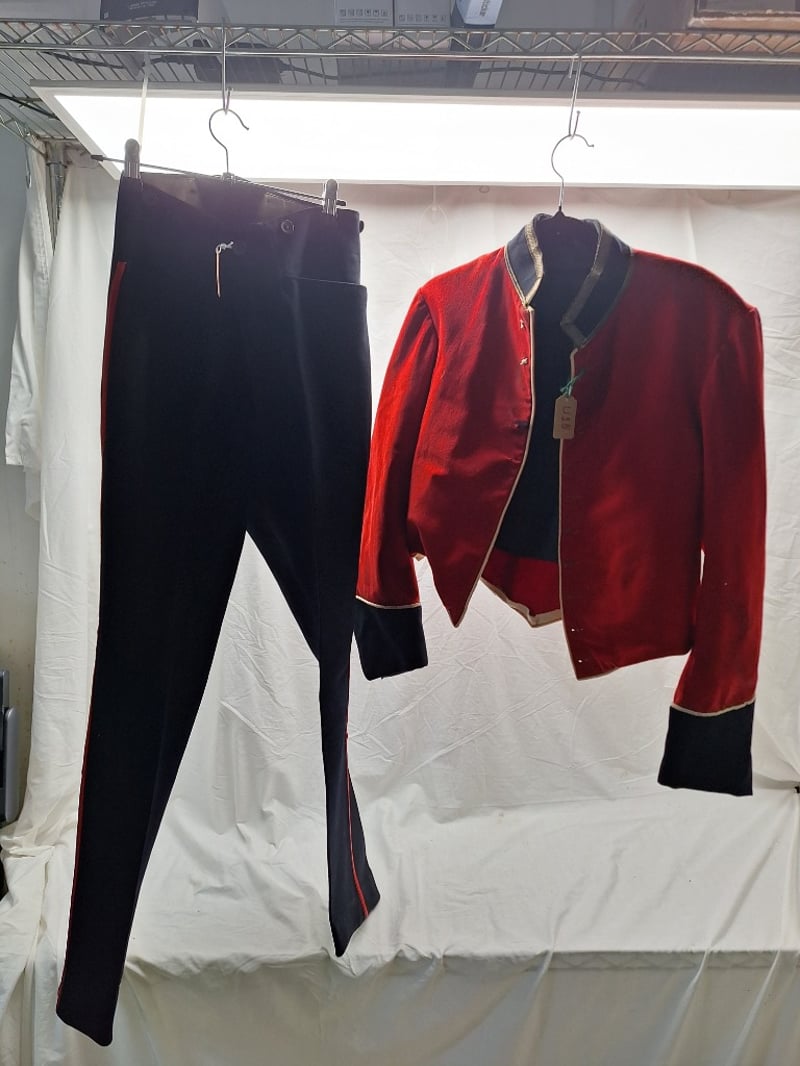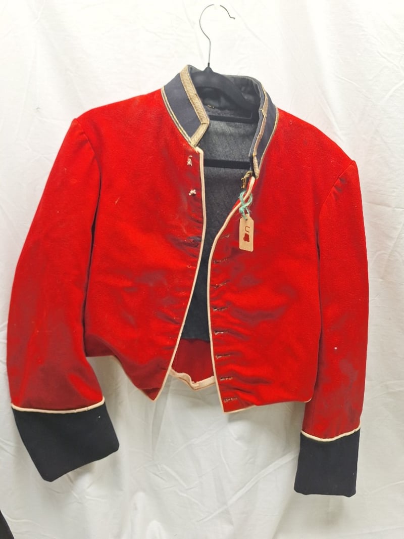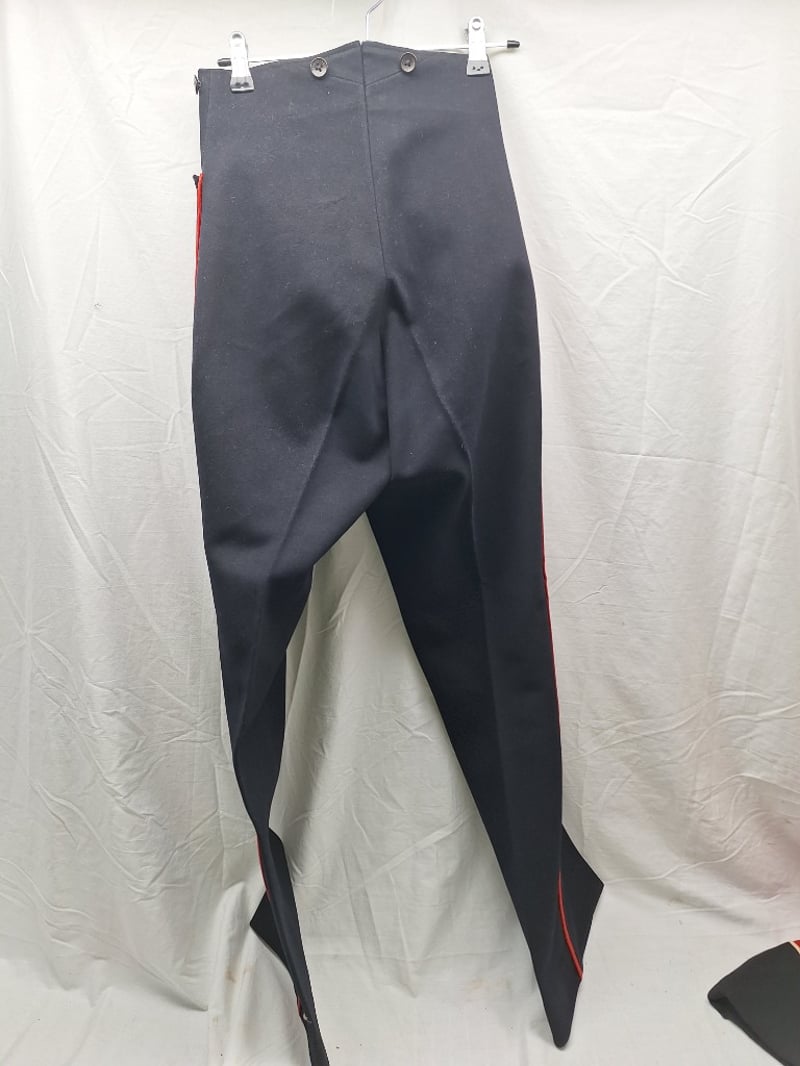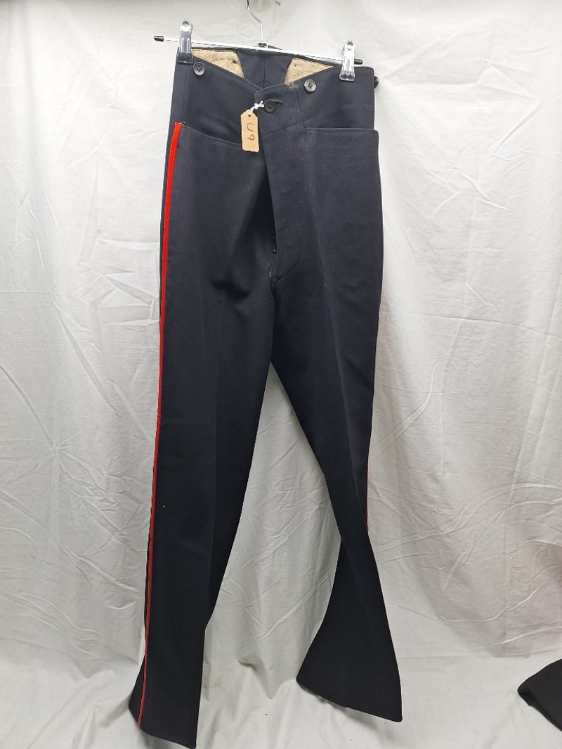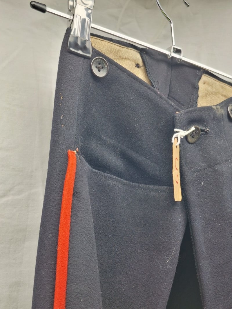 British/Colonial Officers Red Shell Jacket. Blue Facings, Gilt Bullion Trim To Collar. No Buttons Or Lining. Some Stains. Complete British Infantry Pattern Victorian-Edwardian Oxford Mix Trousers. Dark Blue With Thin Red Welt, Used By Infantry. Made By Hobson & Sons.