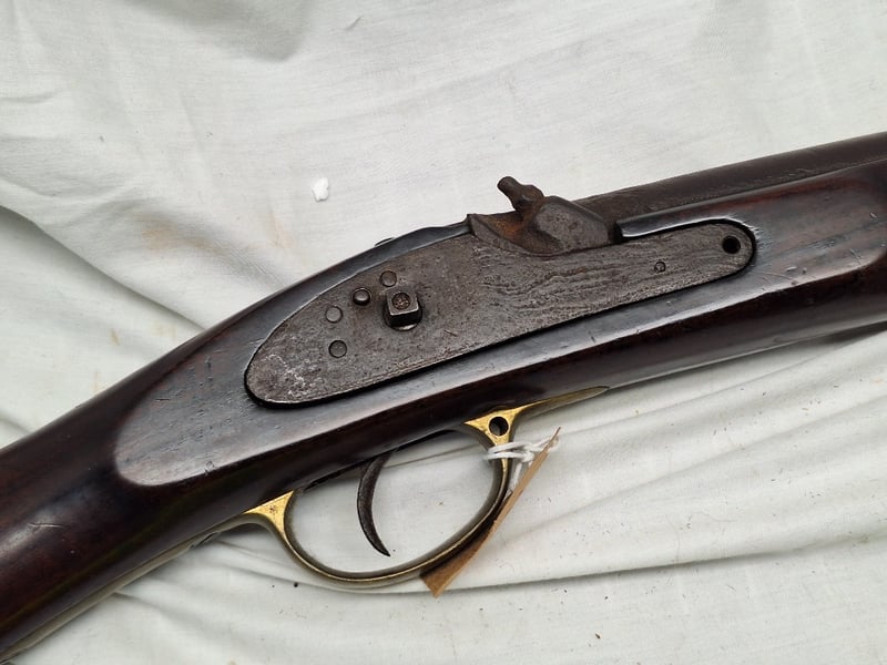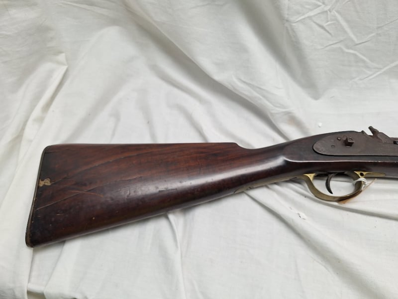 This Is The Smoothbore Indian Issue Version Of The 1853 Rifle. Post Mutiny, Indian Troops Were Provided With Smoothbore Muskets. Missing Hammer And Ram Rod. Some Damage To Stock