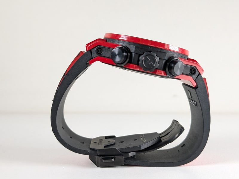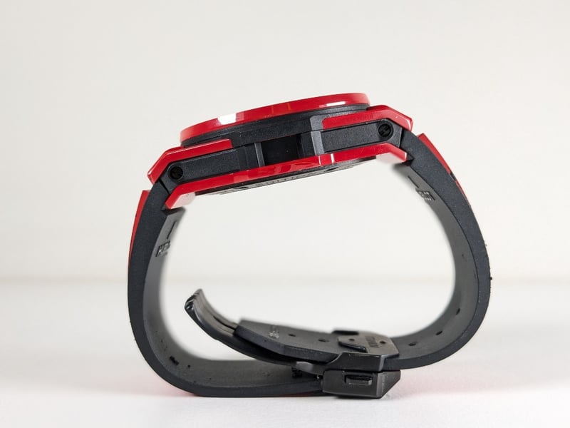 BRACELET: BLACK AND RED STRUCTURED LINED RUBBER STRAPS, WITH BLACK CERAMIC AND BLACK-PLATED TITANIUM DEPLOYANT BUCKLE CLASP