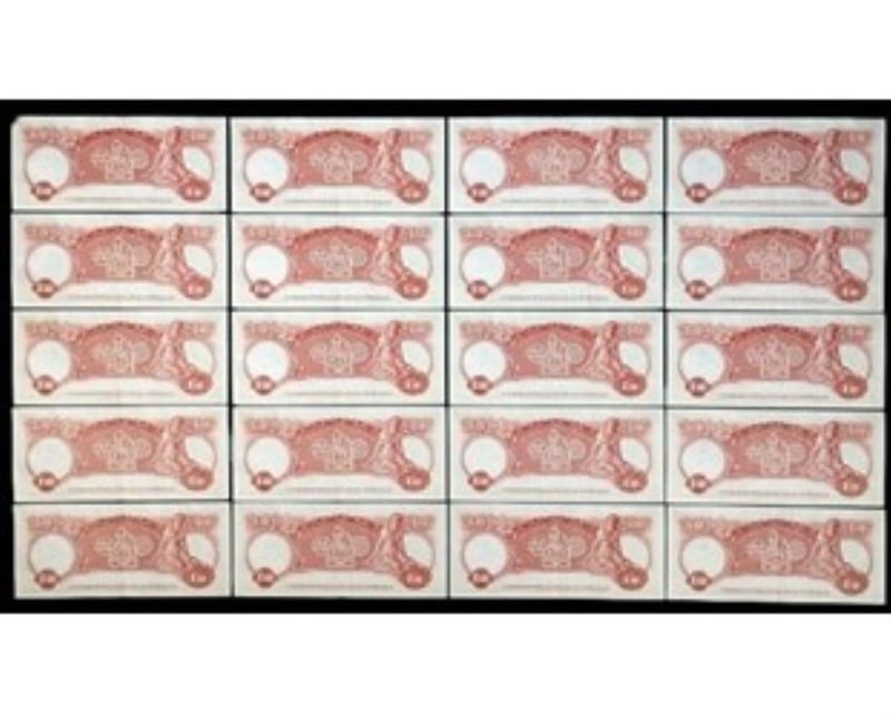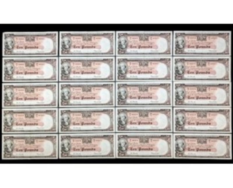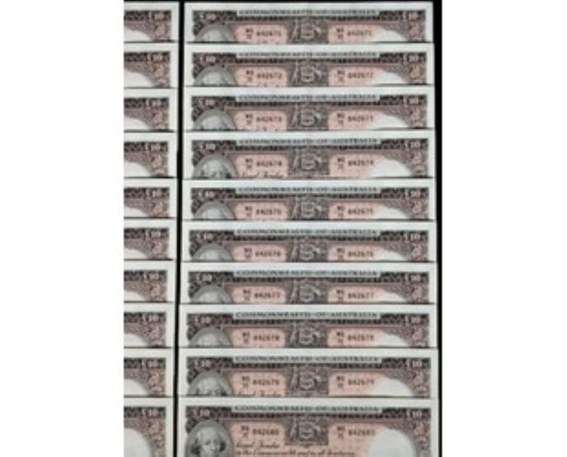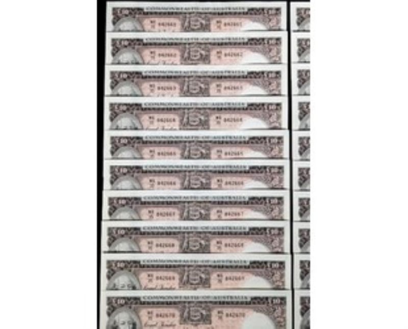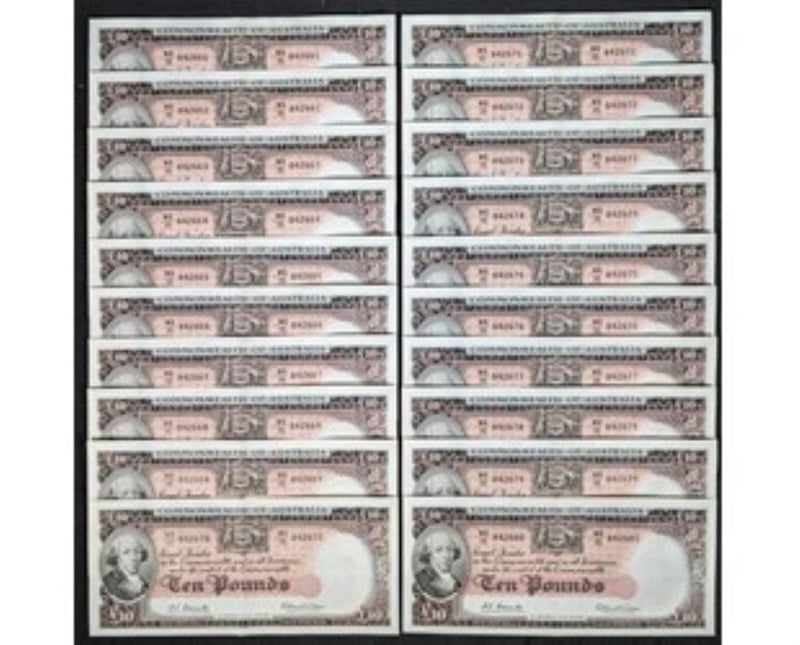 TWENTY (20) CONSECUTIVE AUSTRALIAN 1960 10 POUND COOMBS/WILSON BANKNOTES. SN: WA842661 THROUGH TO WA842680 1960 COOMBS WILSON TEN POUNDS COMMONWEALTH BANK CONSECUTIVE RUN - EXTREMELY RARE FRESH AND CRISP NOTES BANK HANDLING CENTRE FOLD IS PRESENT - REFER TO IMAGES CONDITION: EF