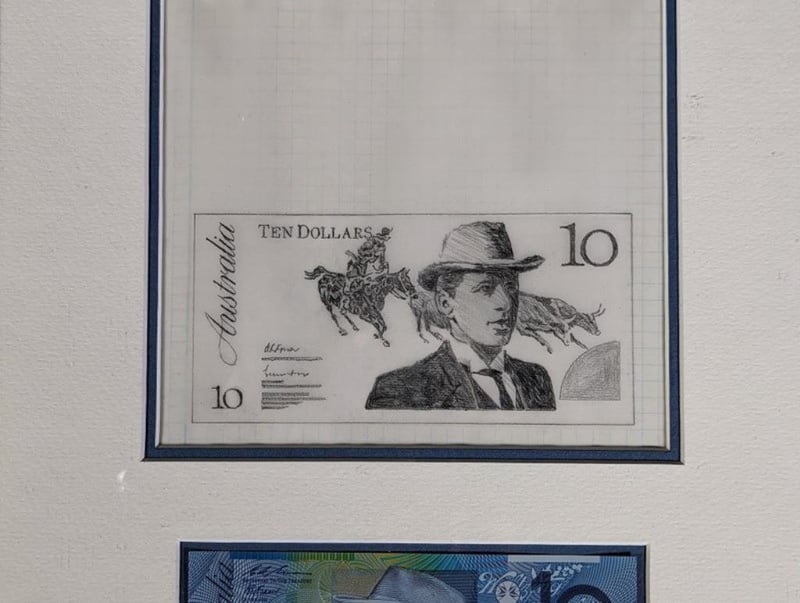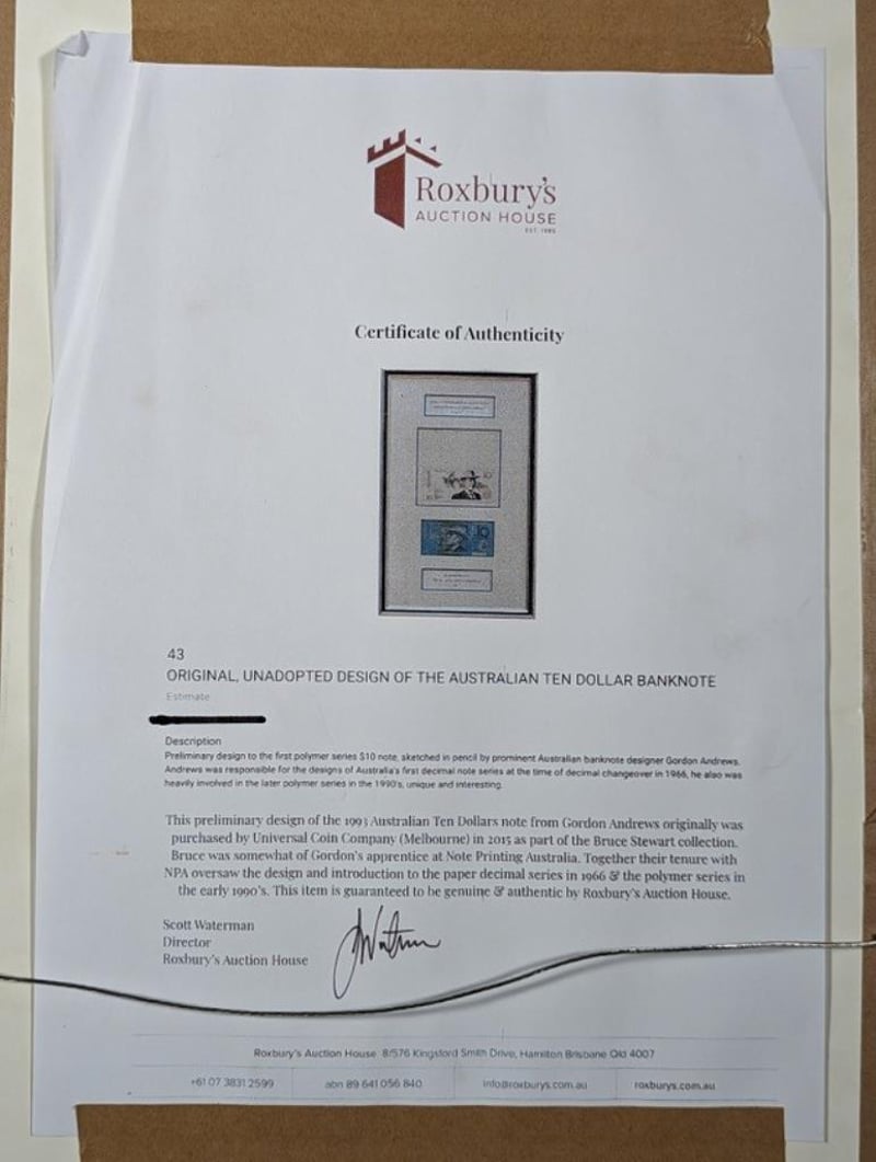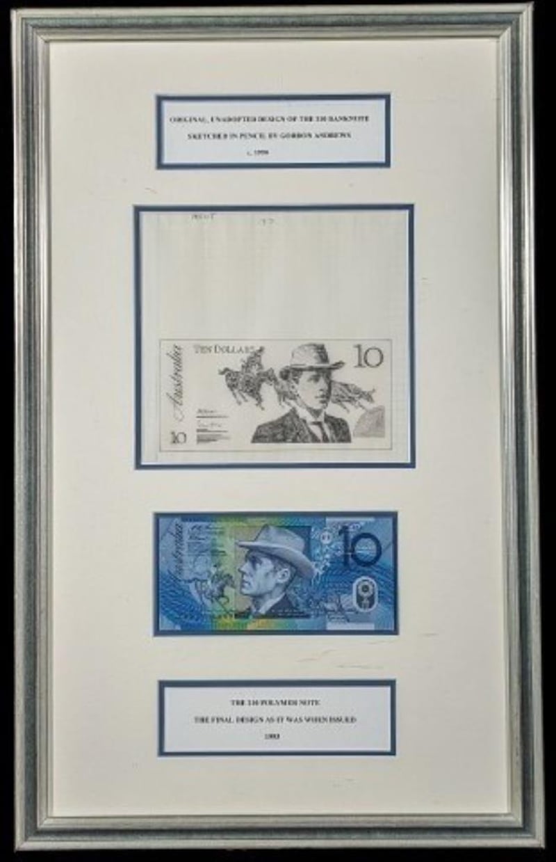 ORIGINAL AUSTRALIAN $10 UNADOPTED DESIGN PENCIL SKETCH AND FINAL DESIGN $10 BANKNOTE - FRAMED FRAMED PRELIMINARY DESIGN FOR THE FIRST POLYMER SERIES (1993) $10 BANKNOTE, SKETCHED IN PENCIL BY PROMINENT AUSTRALIAN BANKNOTE DESIGNER GORDON ANDREWS IN CIRCA 1990. THIS PIECE IS ACCOMPANIED BY THE FINAL DESIGN OF THE 1993 $10 BANKNOTE. INCLUDES CERTIFICATE OF AUTHENTICITY. ANDREWS WAS RESPONSIBLE FOR THE DESIGNS OF AUSTRALIA'S FIRST DECIMAL NOTE SERIES AT THE TIME OF DECIMAL CHANGEOVER IN 1966, HE ALSO WAS HEAVILY INVOLVED IN THE LATER POLYMER SERIES IN THE 1990'S. FRAME SIZE: 49X30CM PROVENANCE: ROXBURY AUCTIONS NO 107, THEN PRIVATE COLLECTION NSW