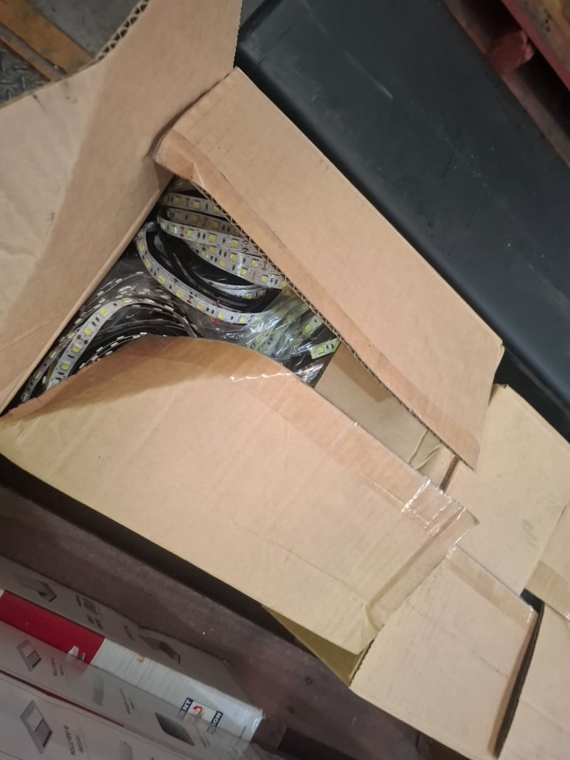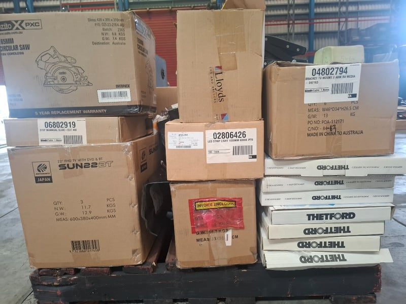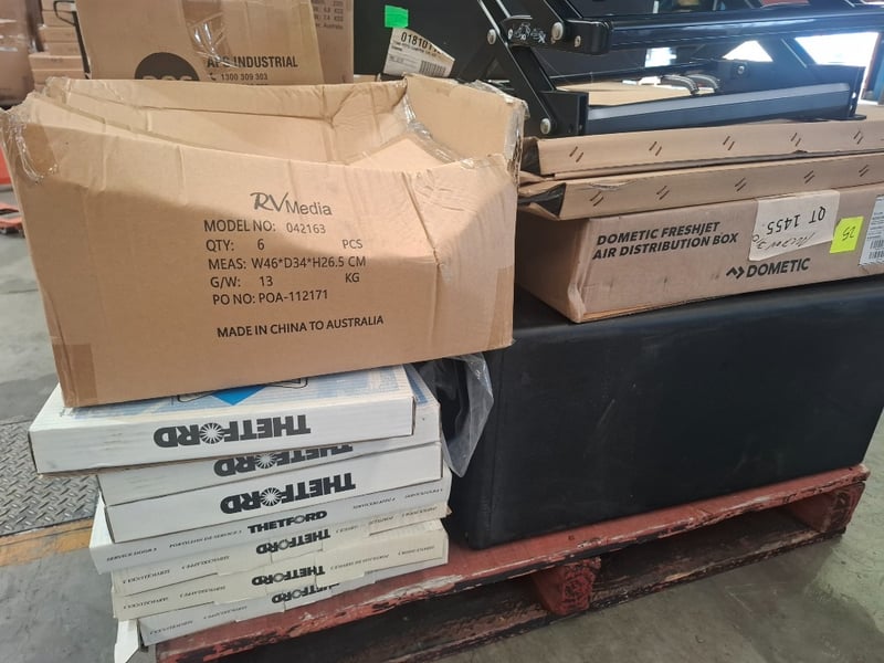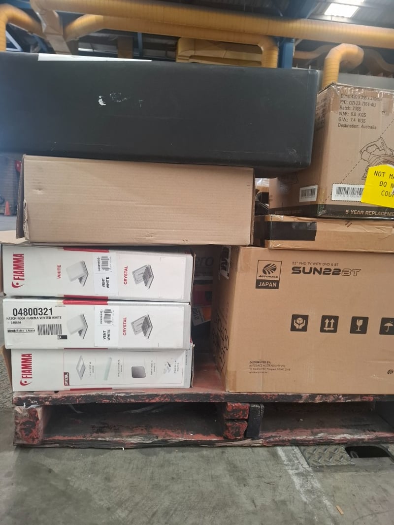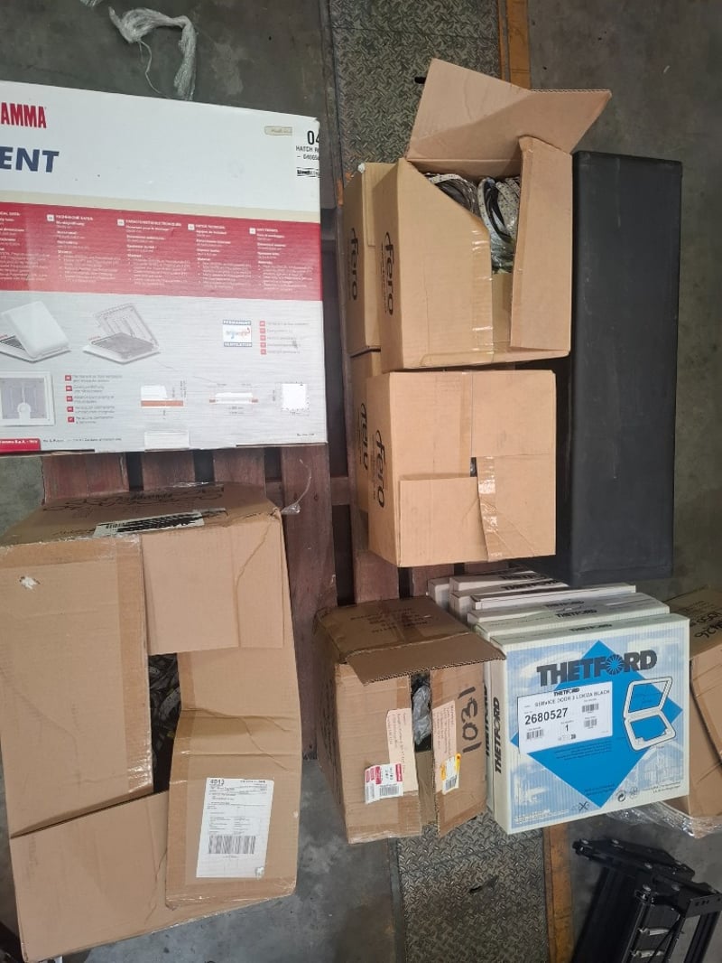 Assortment pallet of caravan components and parts, including hard plastic tank, foldable steep, boxes of LED light, hatch vents and more