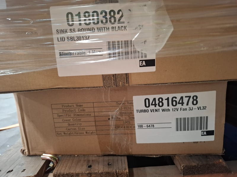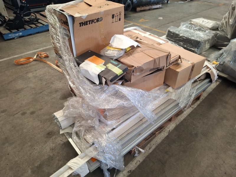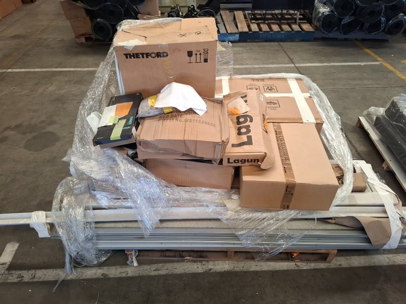 Assortment pallet of caravan parts including toilet cassette swivels white door, roller doors, sink and more