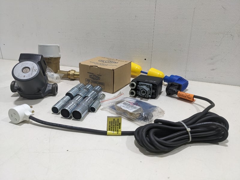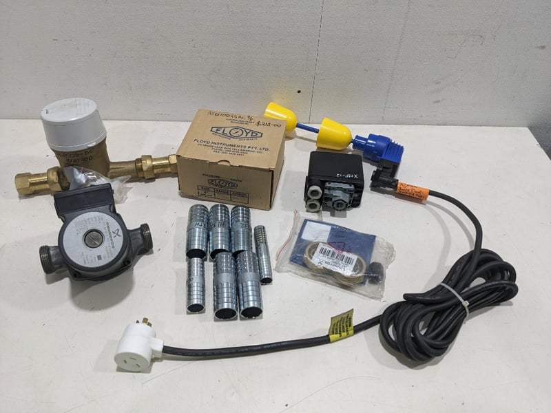 Assorted industrial items, includes circulation pump, brass valve assembly, float switch and more...