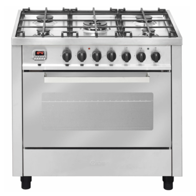 RRP $4,814, ILVE Freestanding Oven/Stove, 90cm, Dual Fuel, Model: V09CSV/SS A statement piece that combines a roomy multifunction oven with a highly capable cooktop—ideal for entertainers and serious home cooks. Key Features • 90cm V-Series freestanding cooker • 5-burner gas cooktop with central wok • Large single electric oven cavity (~110L) • Multifunction settings with fan assist