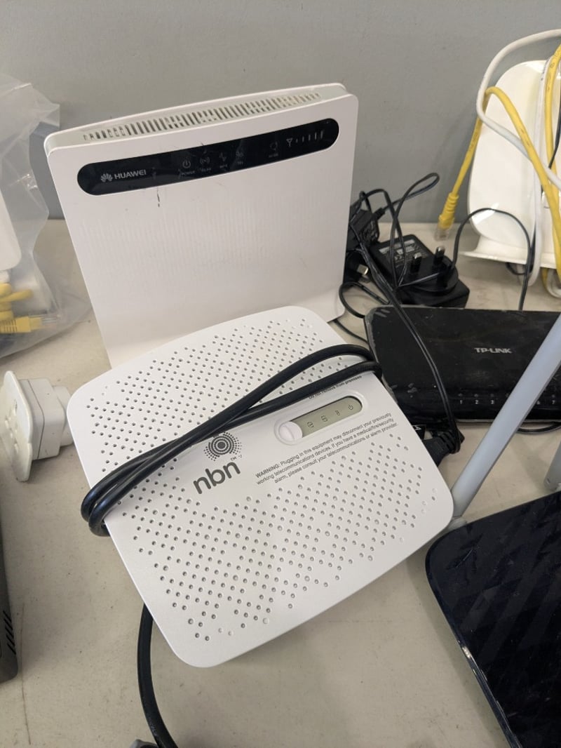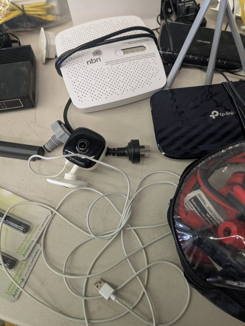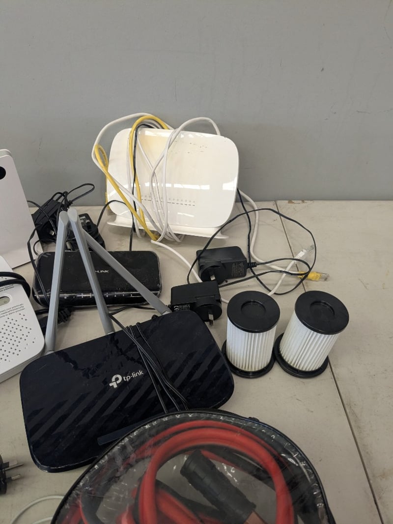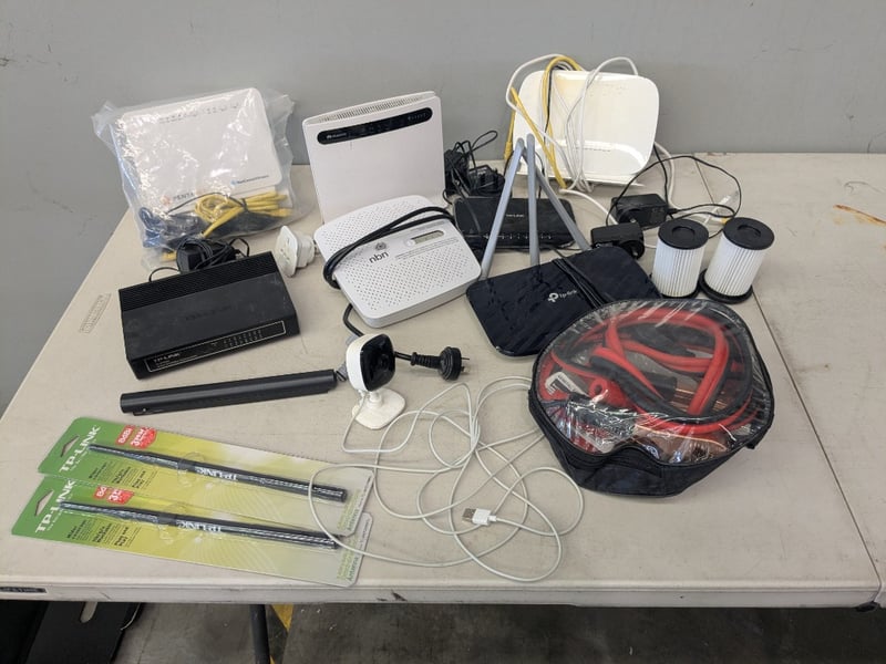 Assorted networking equipment and mixed electronics including, Modems, Routers & Networking Gear – TP-Link, Huawei, NBN Boxes, Wi-Fi Antennas, Ethernet Cables, CCTV Camera & Jumper Leads.