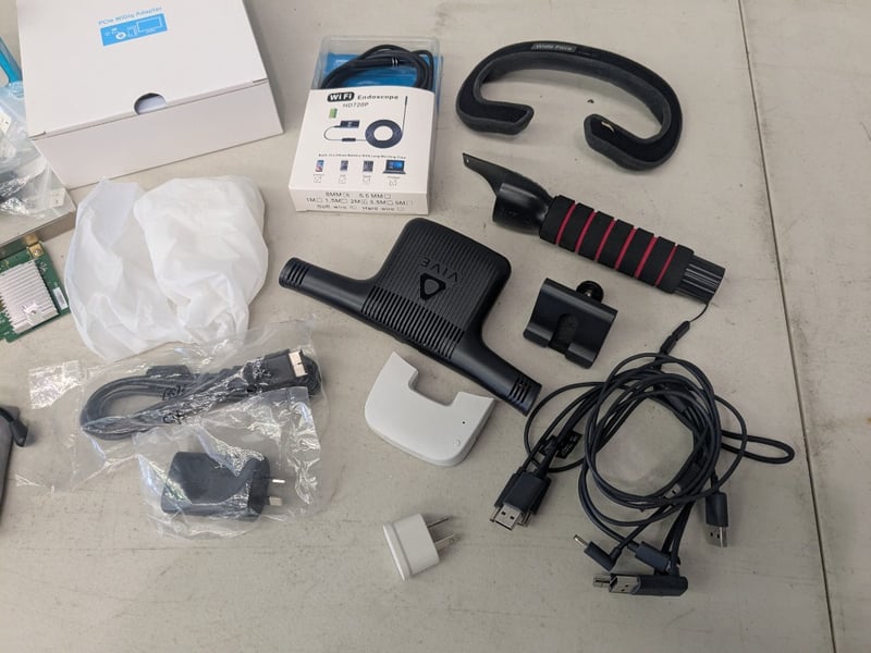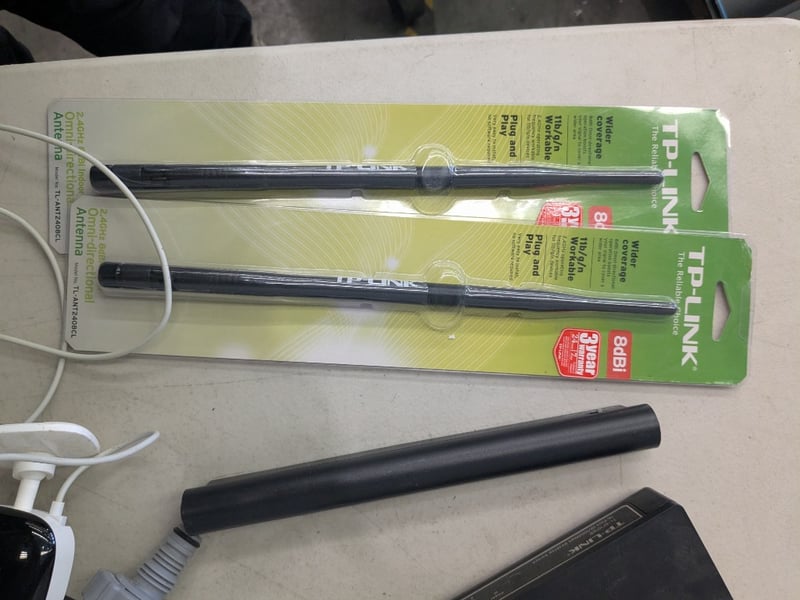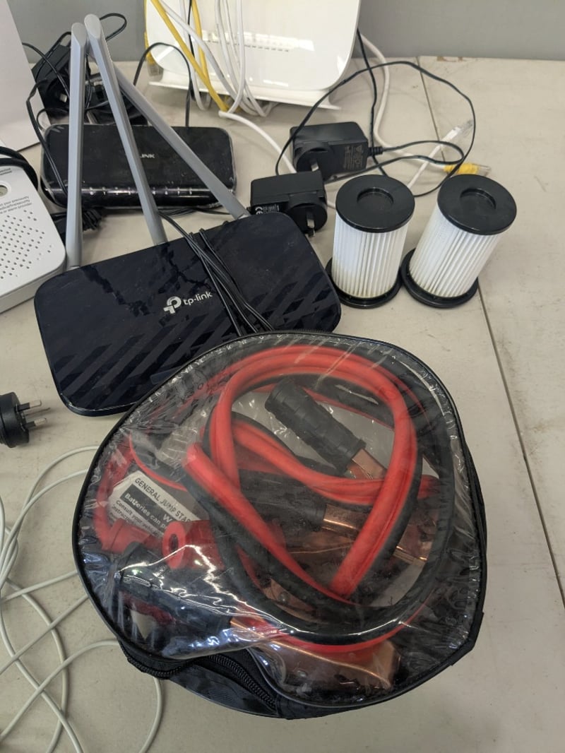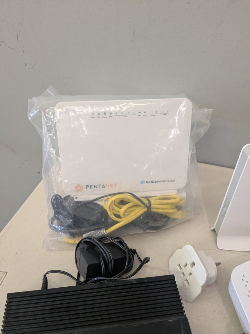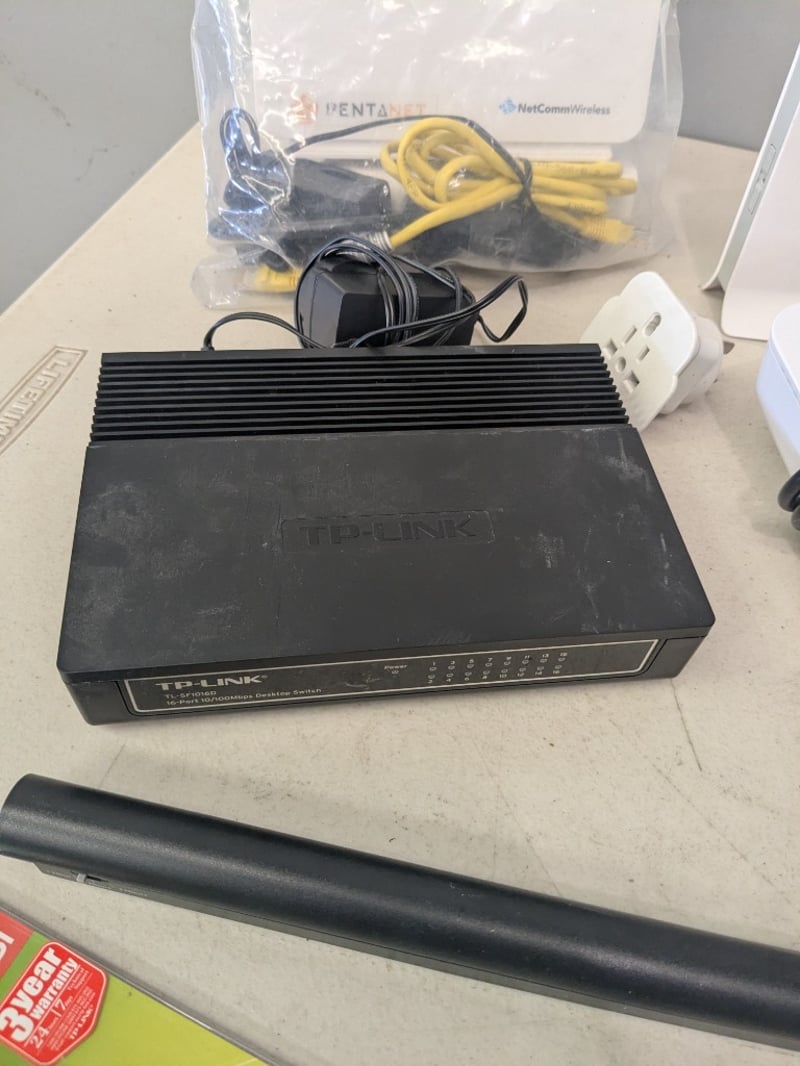 Assorted networking equipment and mixed electronics including, Modems, Routers & Networking Gear – TP-Link, Huawei, NBN Boxes, Wi-Fi Antennas, Ethernet Cables, CCTV Camera & Jumper Leads.