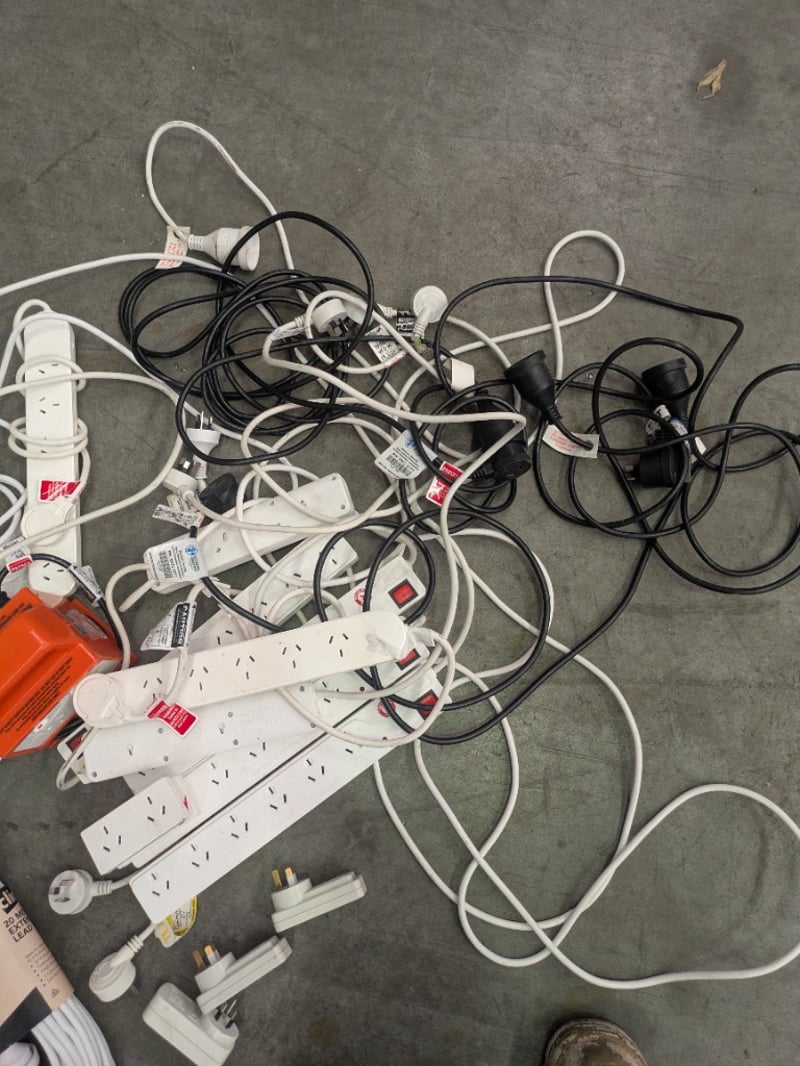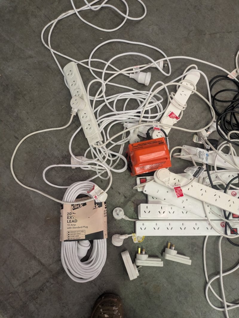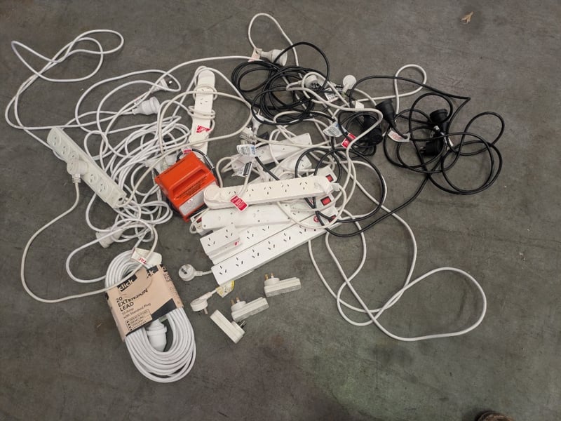 ASSORTED EXTENSION LEADS, POWER BOARDS & ACCESSORIES (UNTESTED)Large mixed lot including multiple extension leads (various lengths), several power boards with switches, an orange portable outlet box, and assorted plug adapters.Sold as lot. Untested.