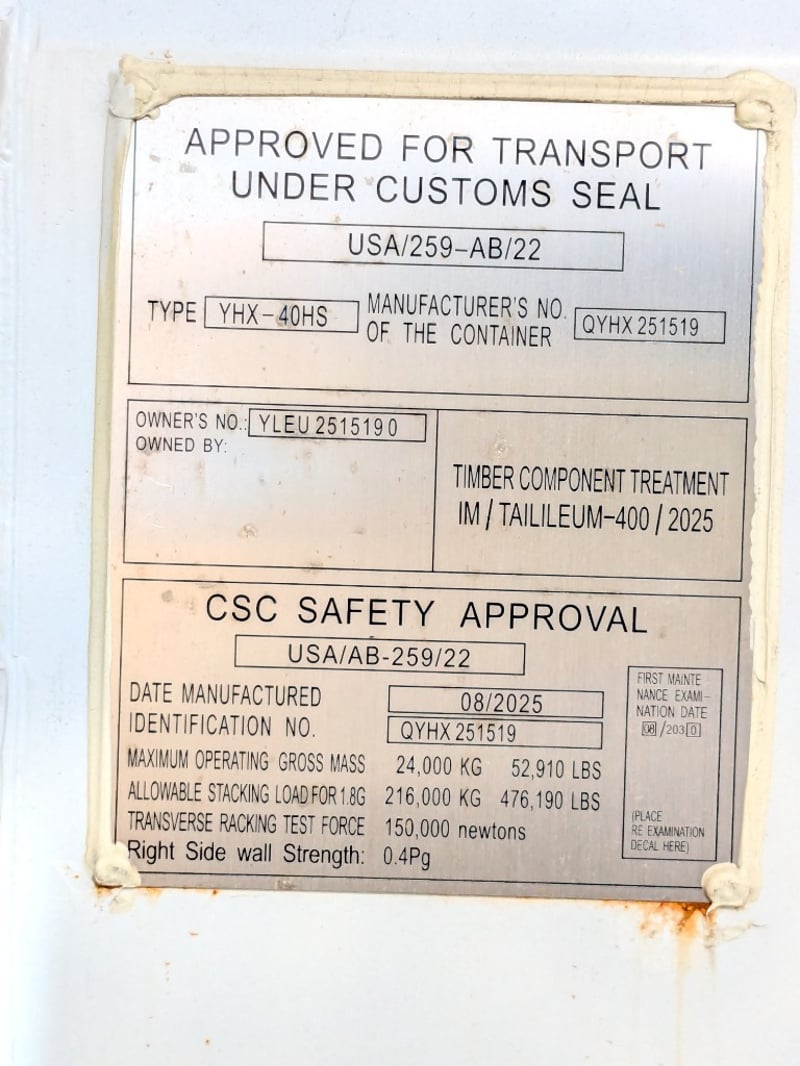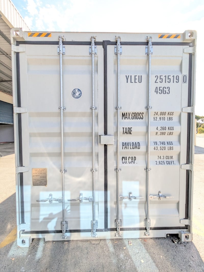 FACTORY DIRECT** 2025 CTN Storage 40ft HQ Container, one side multi-door,4 doors 40FT HQ Side Opening Container one side multi-door,4 doors Model: YLEU2515190 FEATURES: - Four Side Opening Doors - One End Opening Door - Unused - Tare: 4,260Kg - Payload: 19,740Kg - Max Gross: 24,000Kg Dimensions Approx: 2.9mm H x 2.42m W x 12.04m L Please note: minor scuffs and marks may be evident For more information Contact King Cheung on 0477987576 or [email protected] Note: OEM images and VIDEOS shown are for illustration purposes only, and used as a guide only, inspections highly recommended.