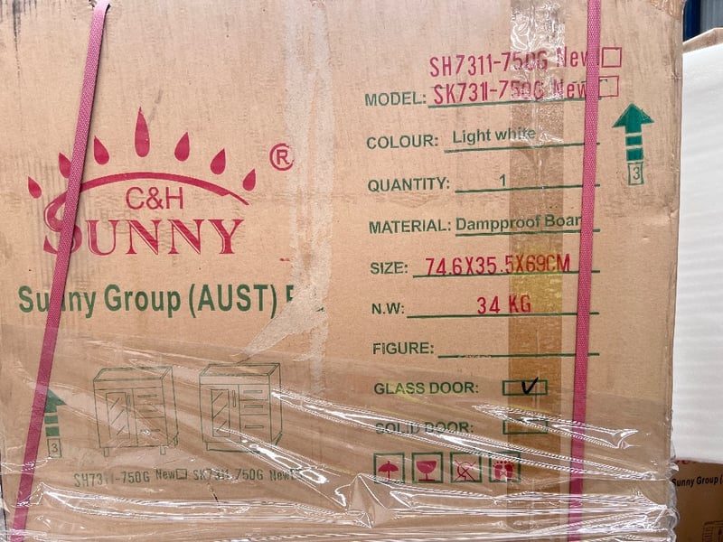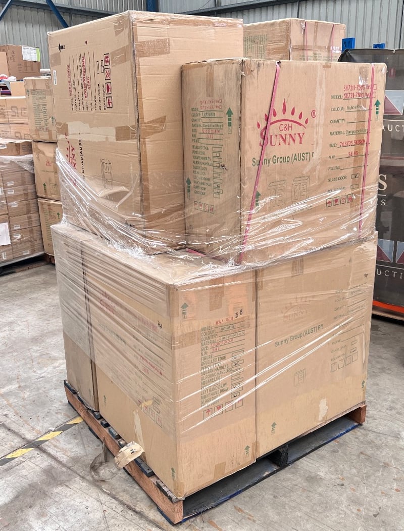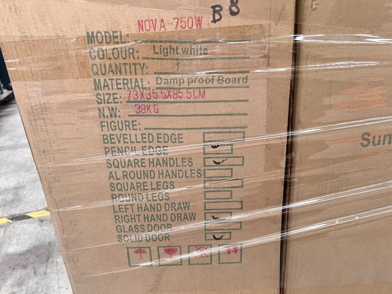 RRP$3843, Bathroom vanities, models include: SK7311-750G (2)/NOVA-750W (4)/BSK28-900W (1), Assorted styles and colours, Qty: 7 pieces to pallet, sold as pallet lot,
