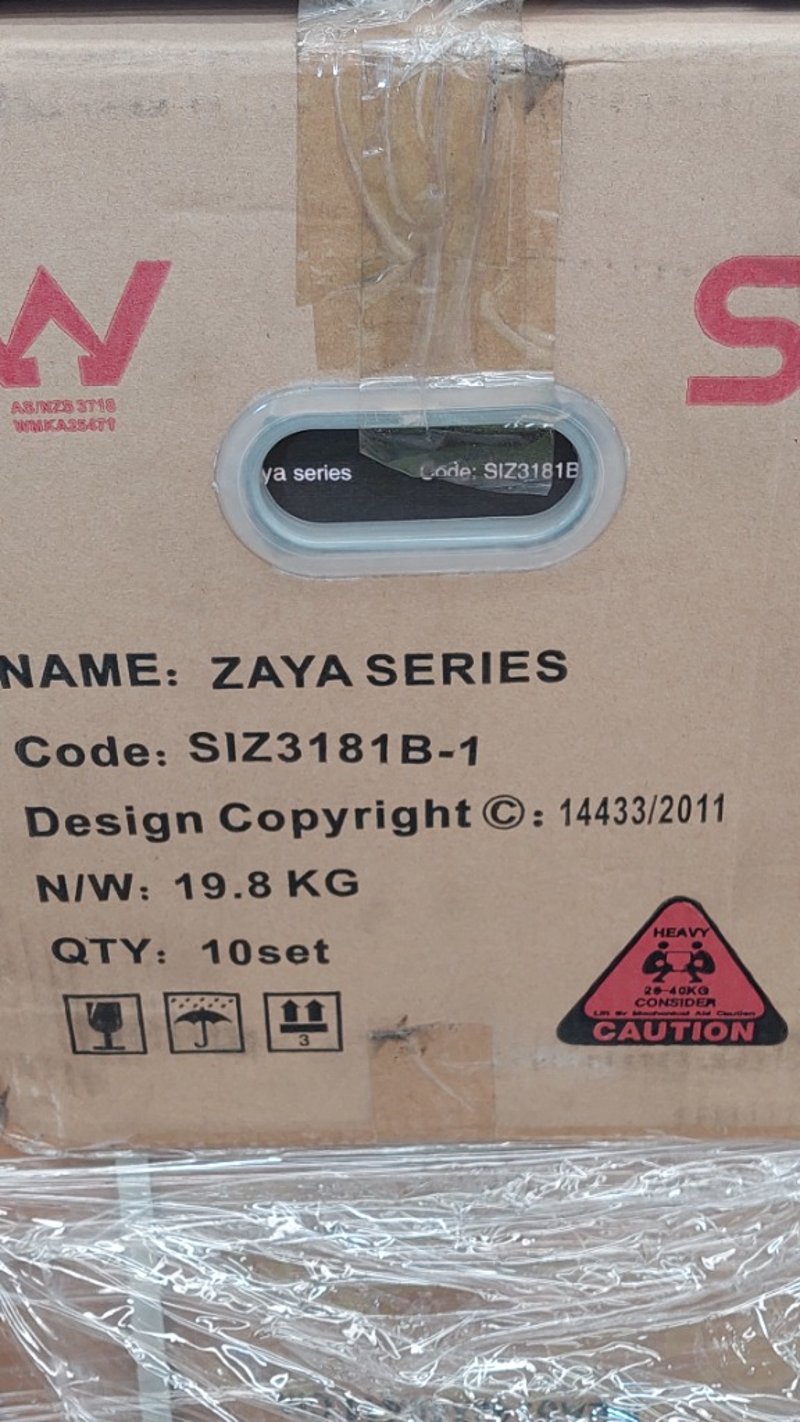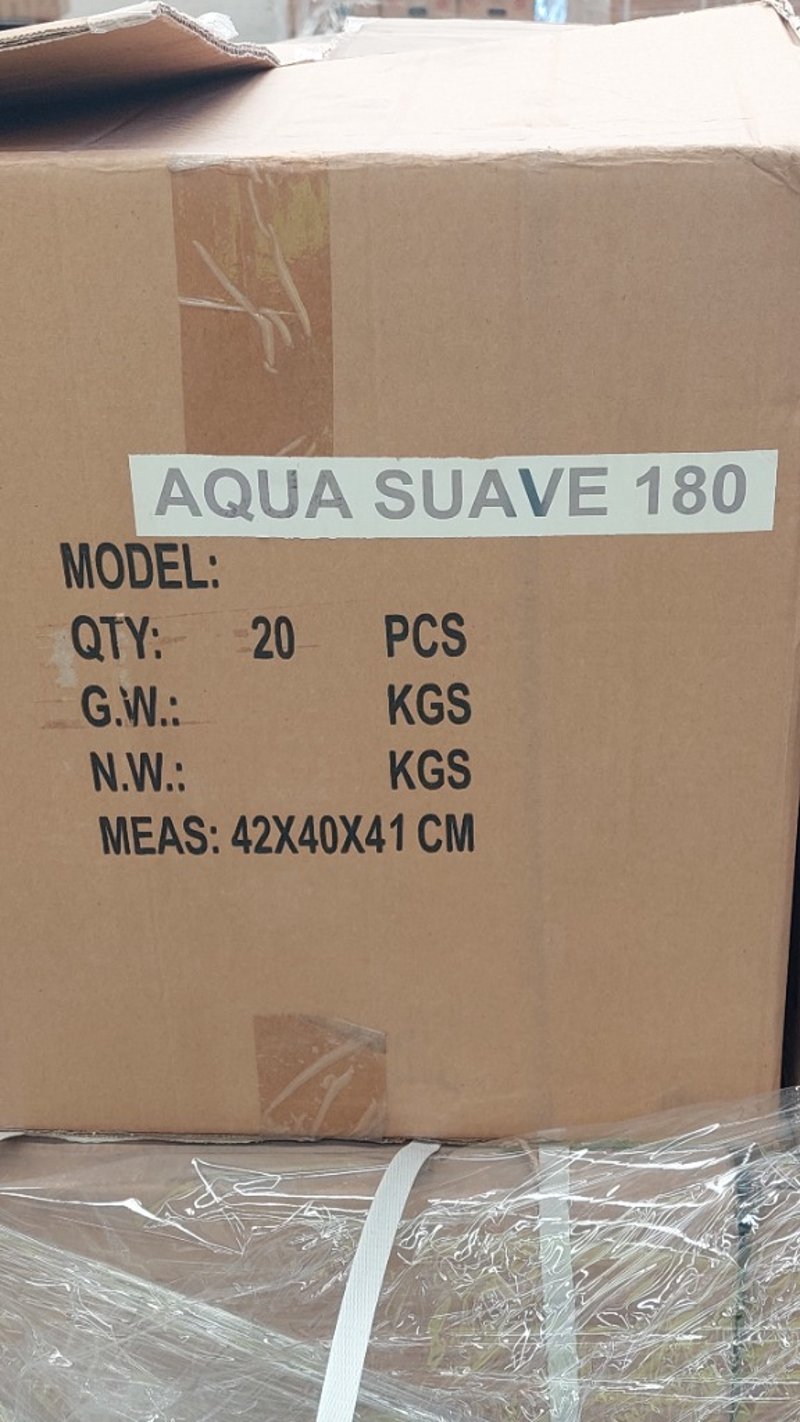 RRP$27,090, SIZ3181B-1, ZAYA SERIES, QTY: 10 PER BOX, 3 BOXES PER PALLET. AQUA SUAVE 180, QTY 20 PER BOX, 9 BOXES PER PALLET. SOLD AS A LOT.