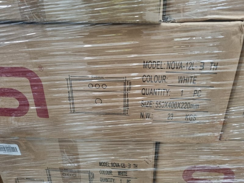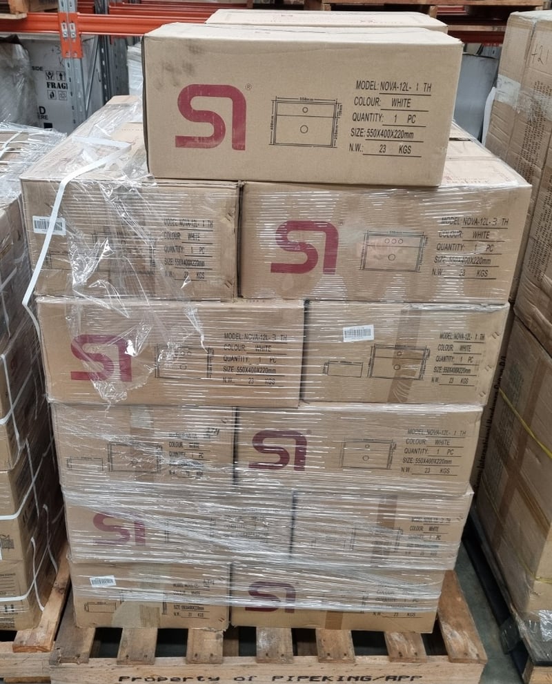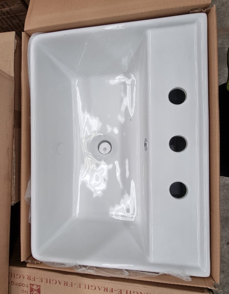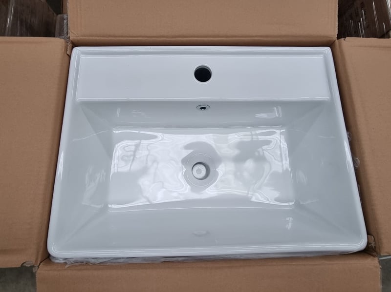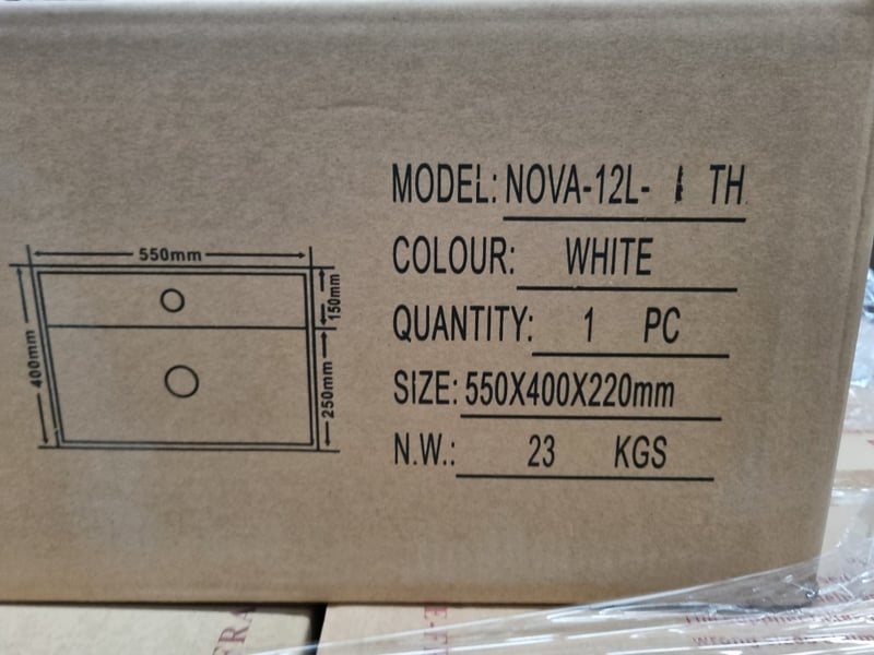 NOVA-12L- I TH, White Countertop Wash Basin, Qty: 15 Boxes, Dimensions: 40x55x22cmNOVA-12L-3 TH, White Countertop Wash Basin, Qty: 7 Boxes, Dimensions: 55x40x22cmSold as pallet lot: 22 Boxs