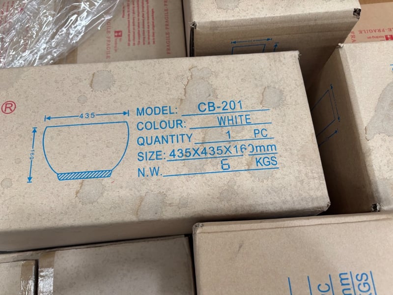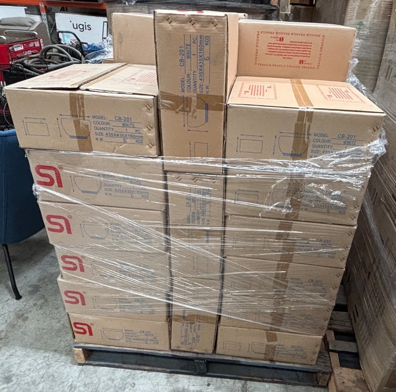 CB-201, White Ceramic Wash Basin,Qty: 36 Box’s Dimensions: 44x44x16cmSold as pallet lot