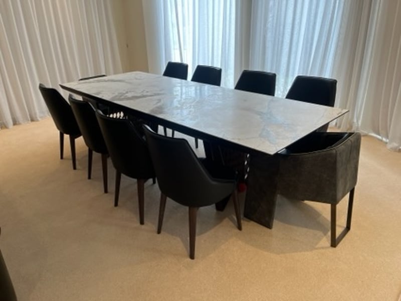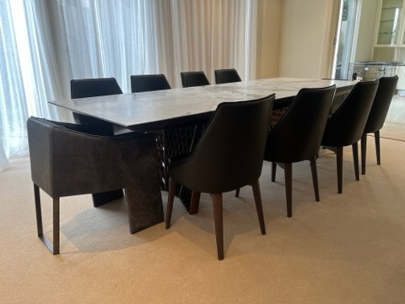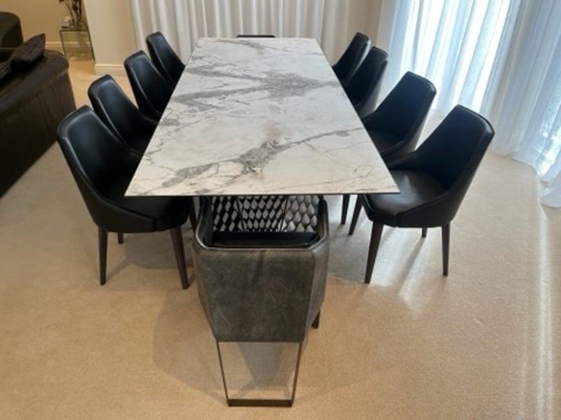 10 seat dining table set Including 2 end Massimo Castagna Ketch Henge Chairs, 8 Black leather chairs made in italy written on the bases, and a white marble with bronze metal base table. Dimensions:290x112x75cm