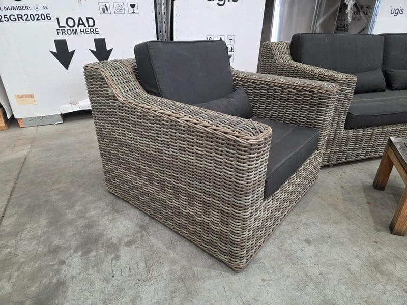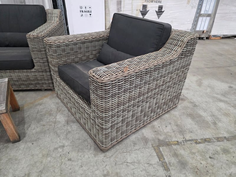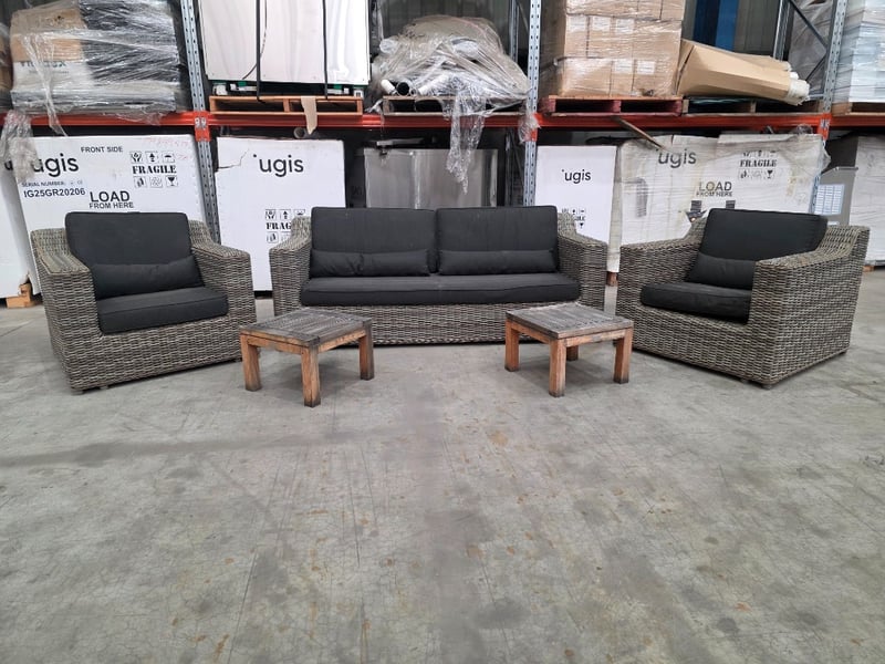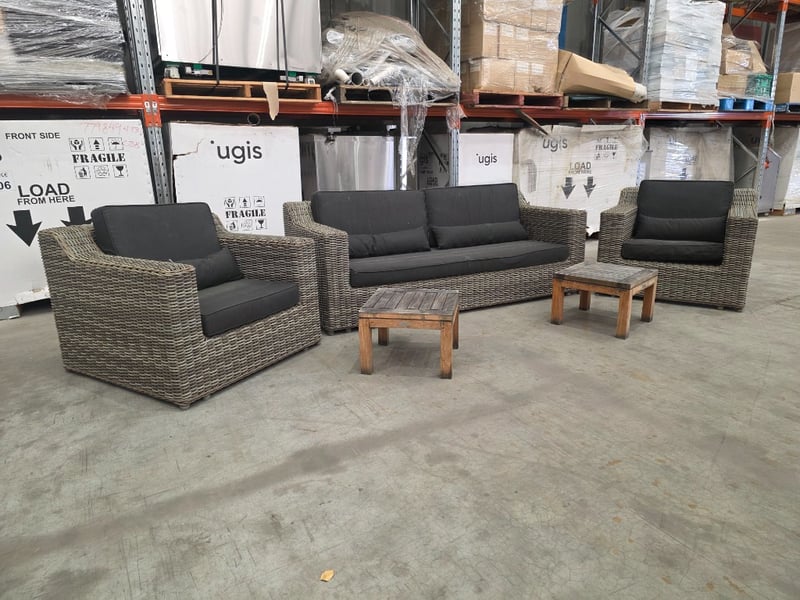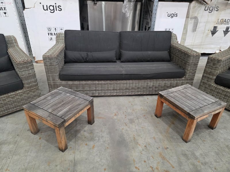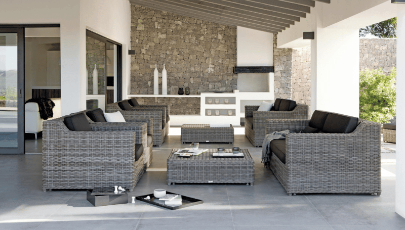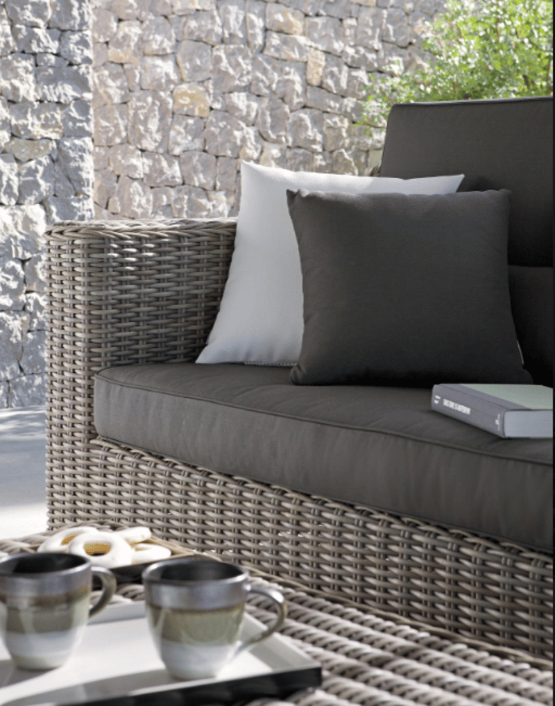 5 San Diego Outdoor set by Manutti with Dravite colour cushions Including 3 seater, 2 single seats, and 2 side tables