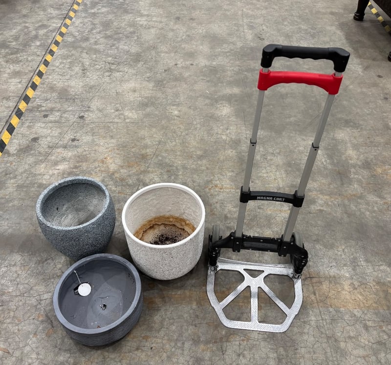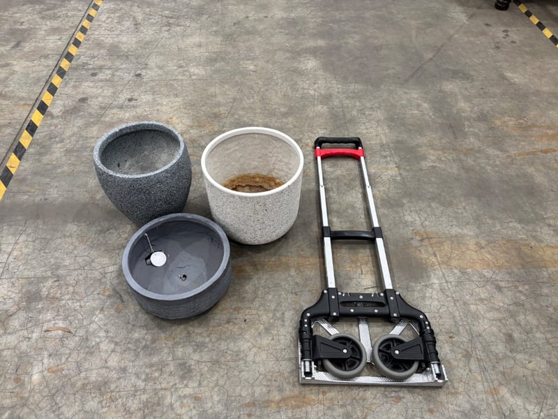 3 Sets of Garden Pots and Foldable Trolly Trolly Dimensions: 38x10x103cm Pots Dimensions: 31x31x30