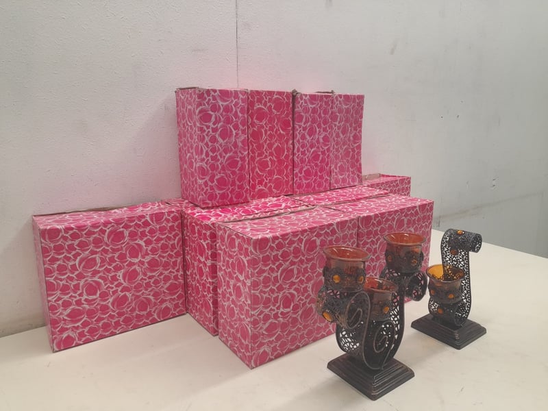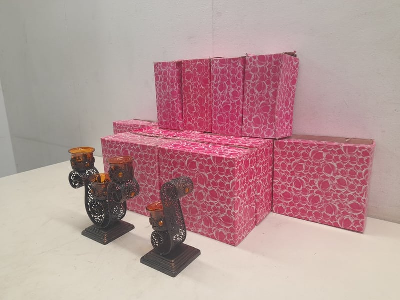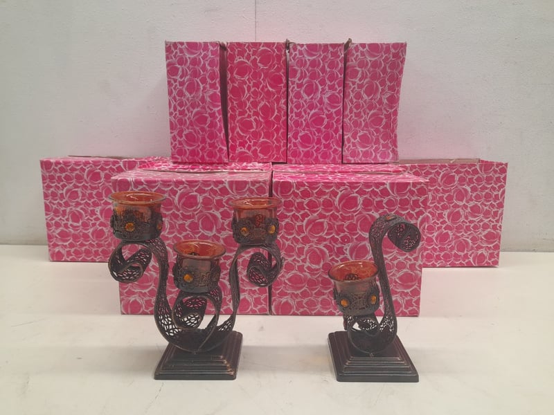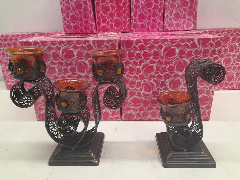 Assorted Candelabra Collection, Tinted Glass Cups, Metal Spiral Frames