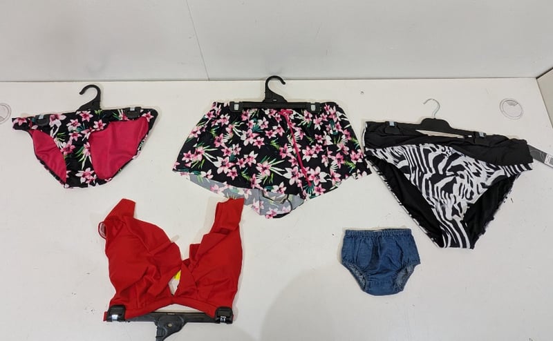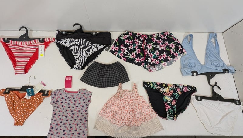 Box of Mixed Womens/Kids Miss Shop, Regatta, Roxy Swimwear, Bras/Bodysuits and Bottoms Sizes Fits: 000,S,M,3M,20,XXL,L