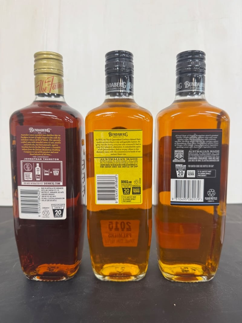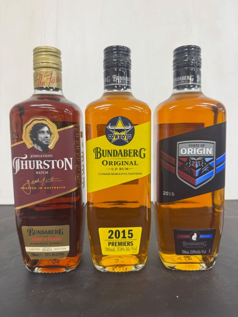 Bundaberg RumJohnathan Thurston #26475Cowboys 2015 PremiersState of Origin 2016(3x700ml bottles) ABV 37%SOLD AS LOT