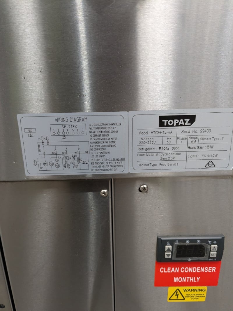 Refrigerator, Topaz, HTCFH12-HA, serial; 99400, Cake Display, 2 Doors, stainless steel Dimensions approx; 116W x 78D x 138H Quantity; 1