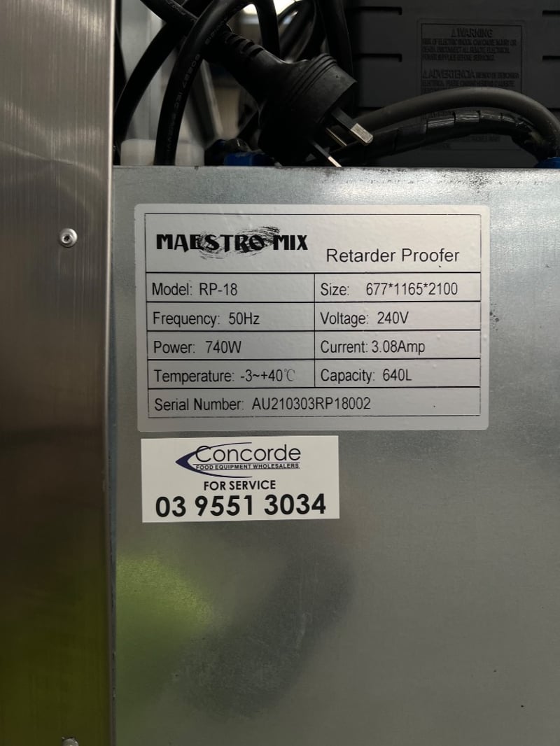 Prover, Maestro-mix, RP-18, serial; AU210303RP18002, heated, 1 door, 9 tray capacity, stainless steel Dimensions approx; 69W x 114.5D x 209H cm Quantity;1