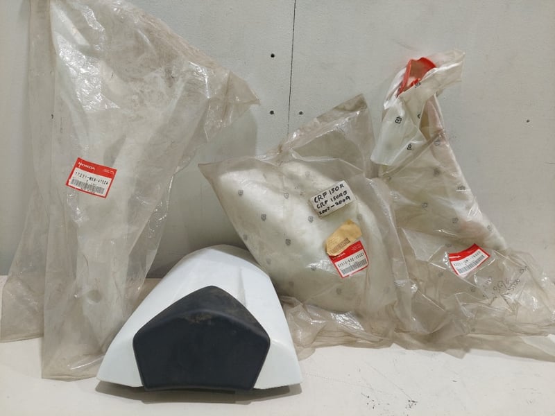 Assorted Honda motorcyle parts. Includes side cover for a Honda CRF150R etc. Sold as lot
