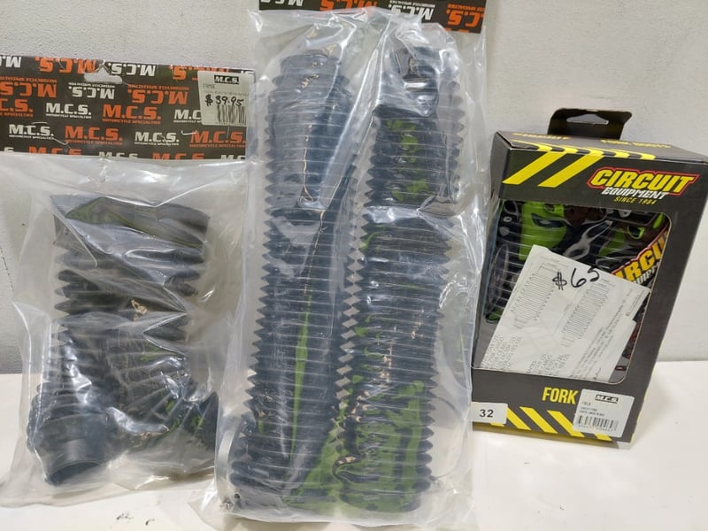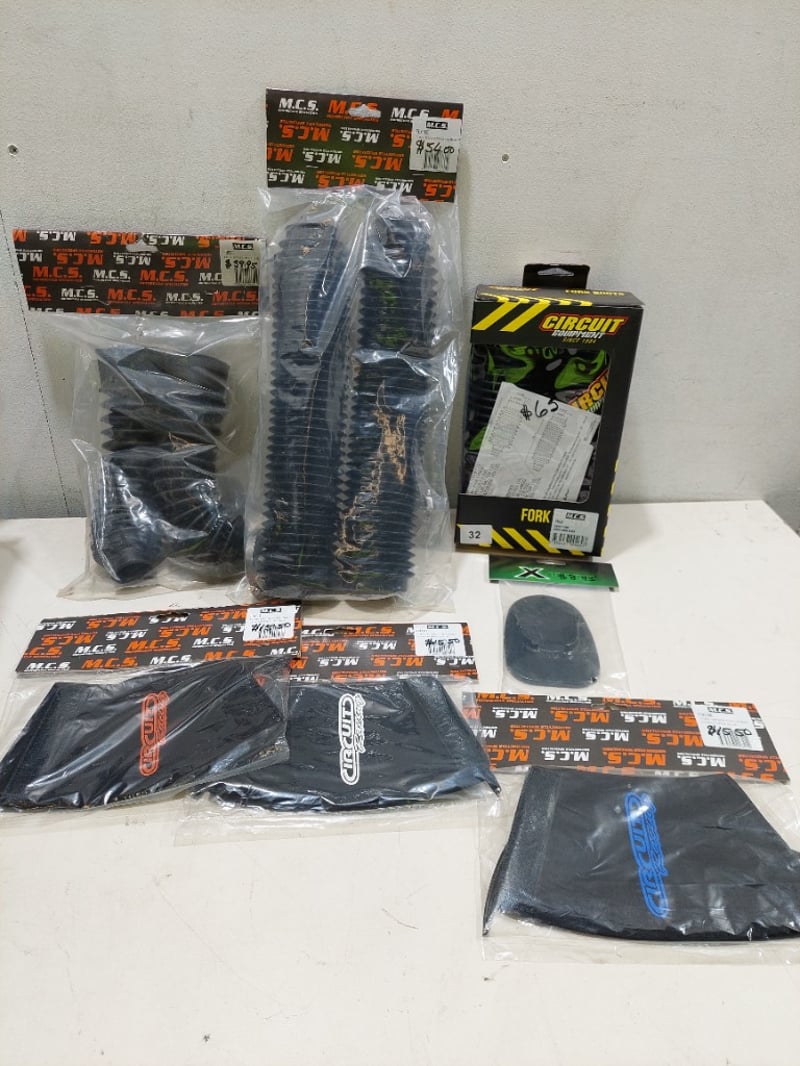 Asoorted motorcycle accessories, including circuit fork boots, fork wipers and more.