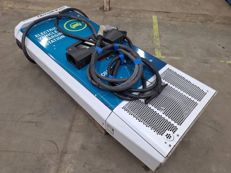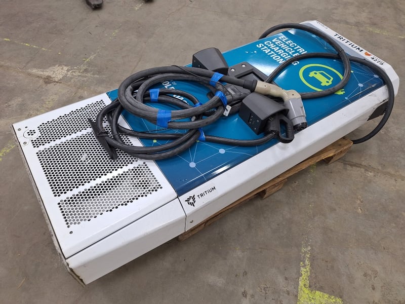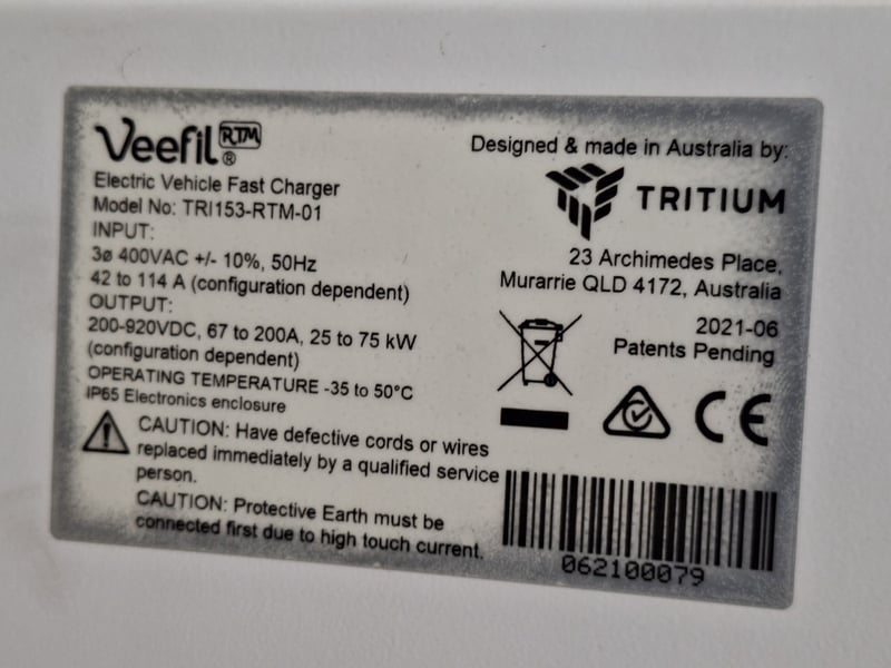 Ex-Govt EV Charging Station (Decommissioned for parts only)Make: TritiumModel TRI153-RTM-01Barcode: 062100079Station: 4279Input: 400VAC +/- 10%, 50Hz42 to 114 A (Configuration Dependent)Output: 200-920VDC, 67 to 200A, 25 to 75 kW(Configuration Dependent)