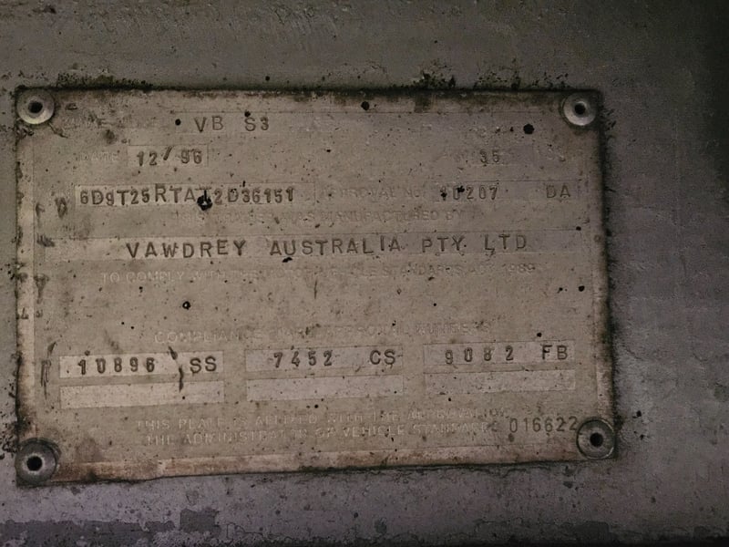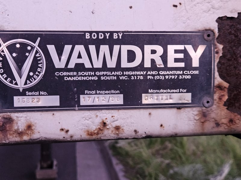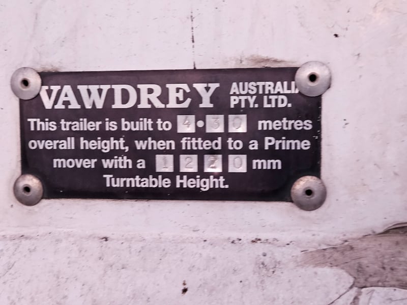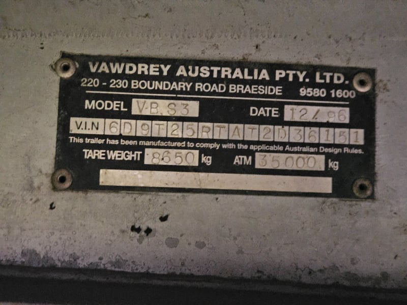 1996 Vawdrey VB S3 Curtainsider B Trailer Year: 1996 Make: Vawdrey Model: VB S3 Body: Curtainsider B Trailer Colour: White Configuration: Tri-Axle Serial No.: 15823 Chassis No.: 6D9T25RTAT2D36151 ATM: 35,000 kg TARE: 8,650 kg Description: Key # No Key