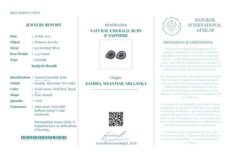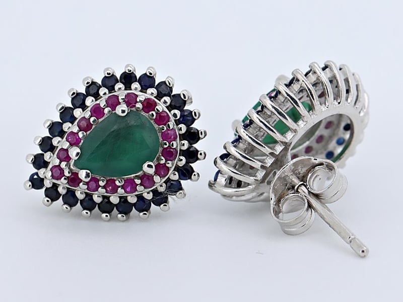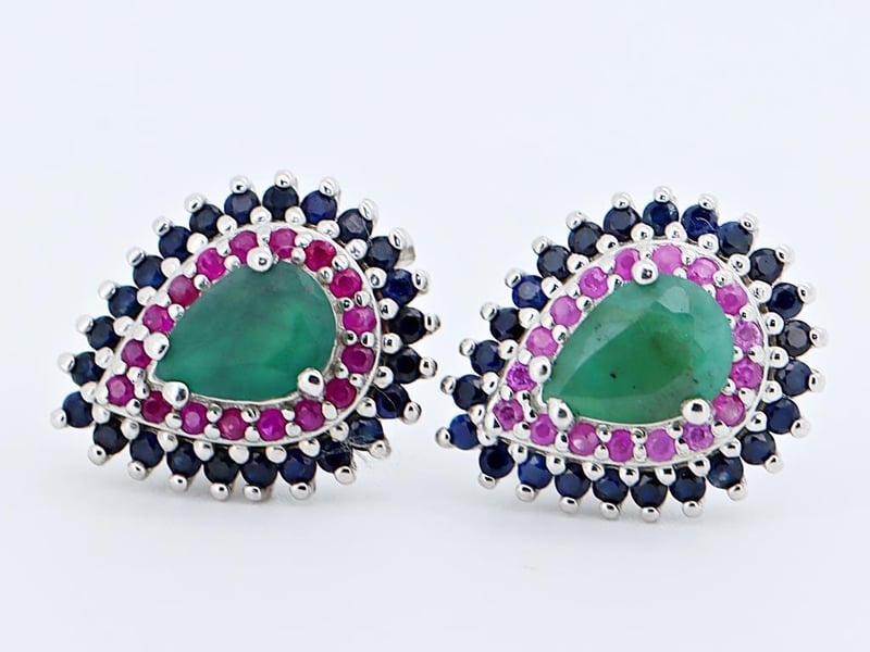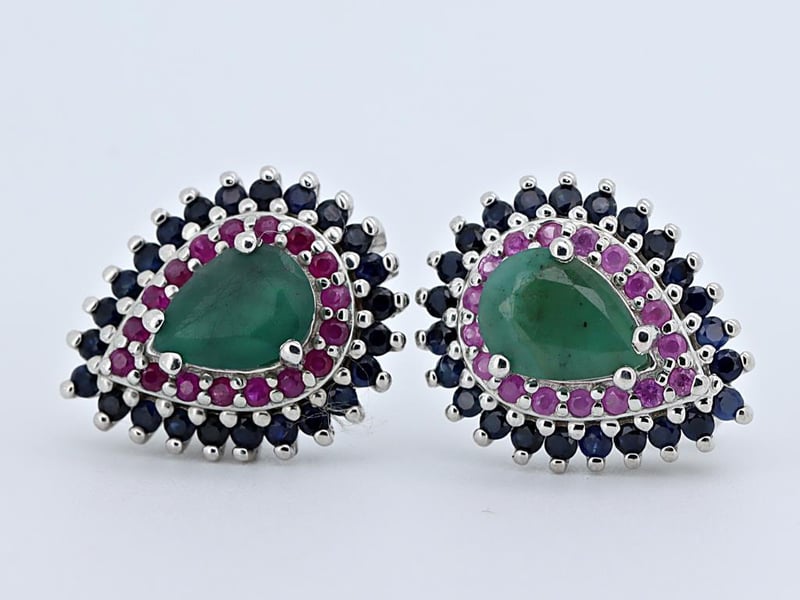 NATURAL EMERALD, RUBY SRI LANKAN SAPPHIRE (UNTREATED) EARRINGS ON 925 SILVER - WITH CERTIFICATE