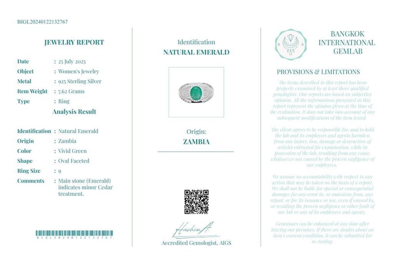 Comments : Main Stone (Emerald) Indicates Minor Cedar Treatment.
