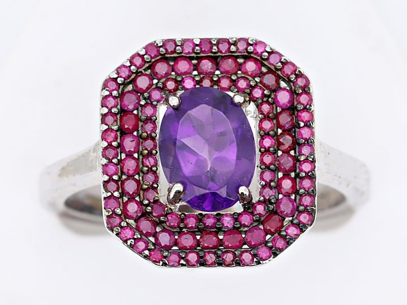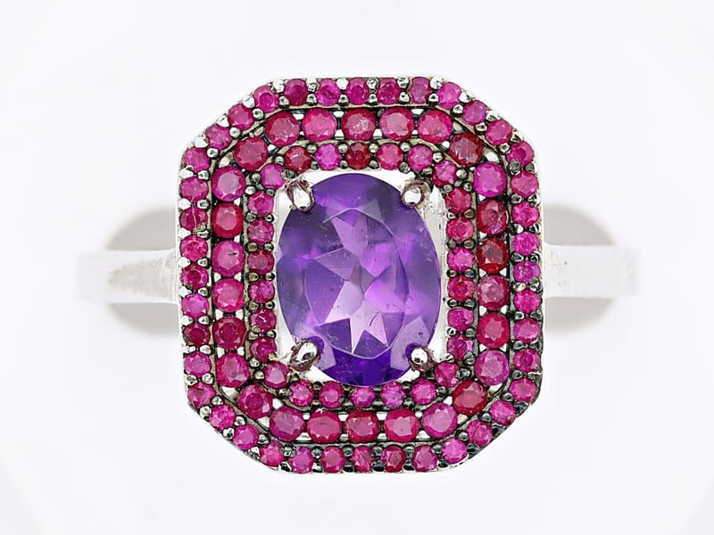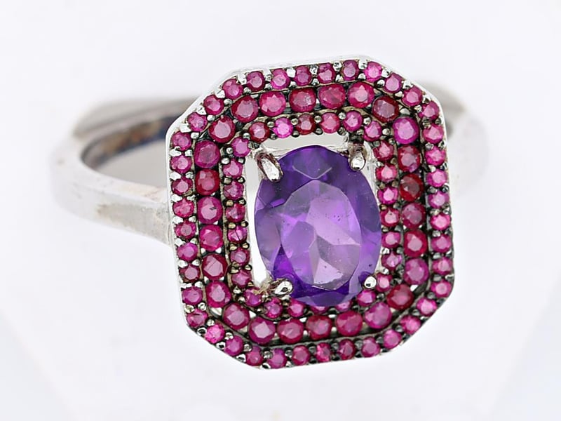 NATURAL AMETHYST & RUBY RING ON 925 SILVER - WITH CERTIFICATE