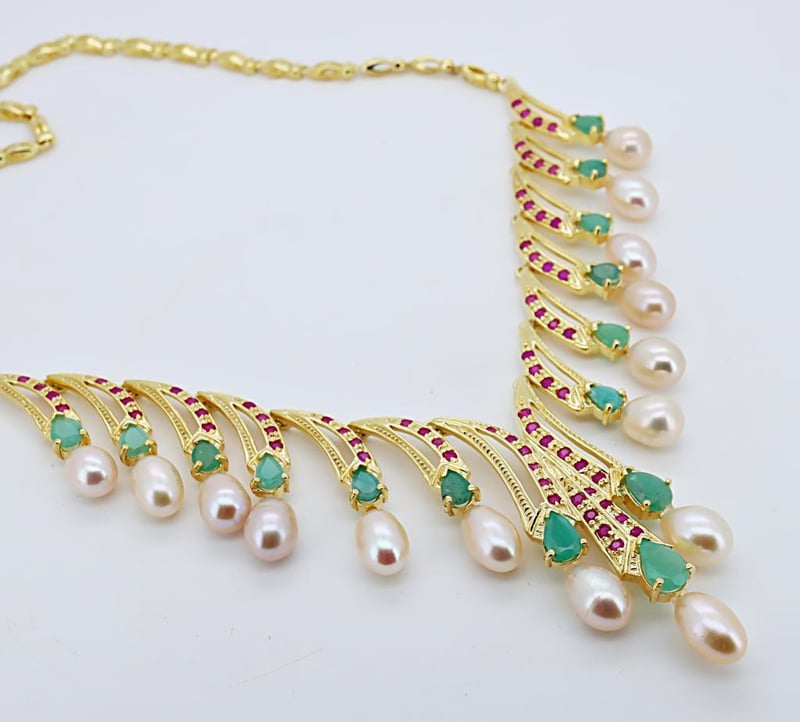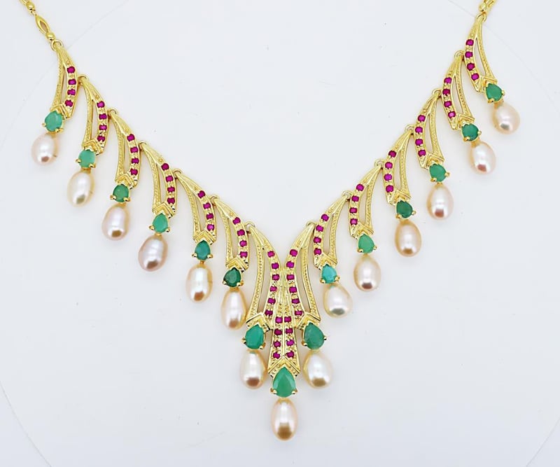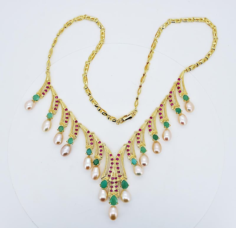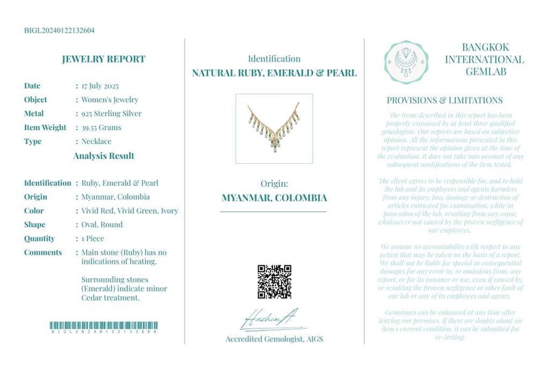 NATURAL RUBY, EMERALD & PEARL NECKLACE ON 925 SILVER - WITH CERTIFICATE Gemstone : Natural Ruby, Emerald & Pearl Certificate Number : Bigl20240122132604 Item Total Weight : 39.55 Grams Main Stone Color : Vivid Red, Vivid Green, Ivory Size : Comments : Main Stone (Ruby) Has No Indications Of Heating. Surrounding Stones (Emerald) Indicate Minor Cedar Treatment. ✻ Verify Report Online At Www.Bangkokinternationalgemlab.Co 0 +9