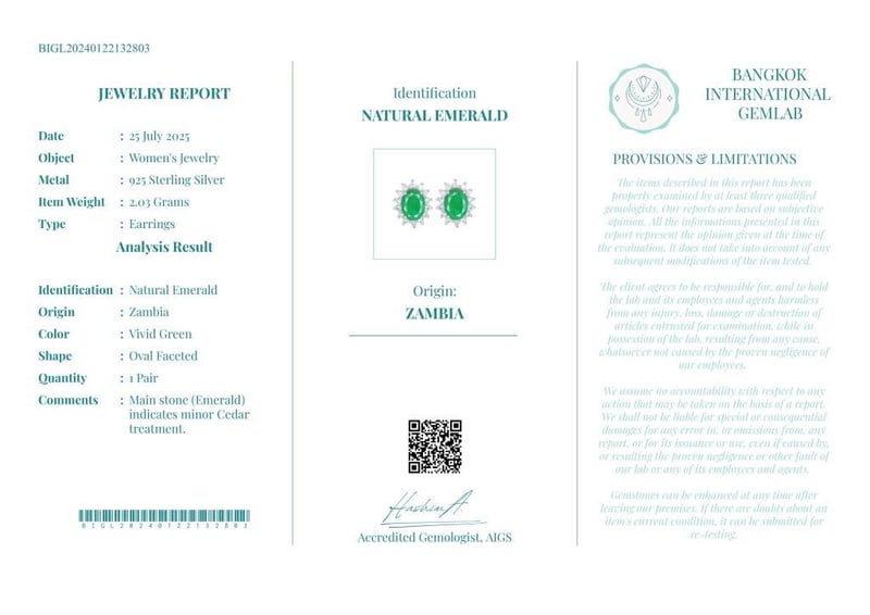 NATURAL ZAMBIAN EMERALD EARRINGS ON 925 SILVER - WITH CERTIFICATE Gemstone : Natural Zambian EmeraldCertificate Number : Bigl20240122132803Item Total Weight : 2.03 GramsMain Stone Color : Vivid GreenSize : Comments : Main Stone (Emerald) Indicates Minor Cedar Treatment. ✻ Verify Report Online At Www.Bangkokinternationalgemlab.Co 0+22
