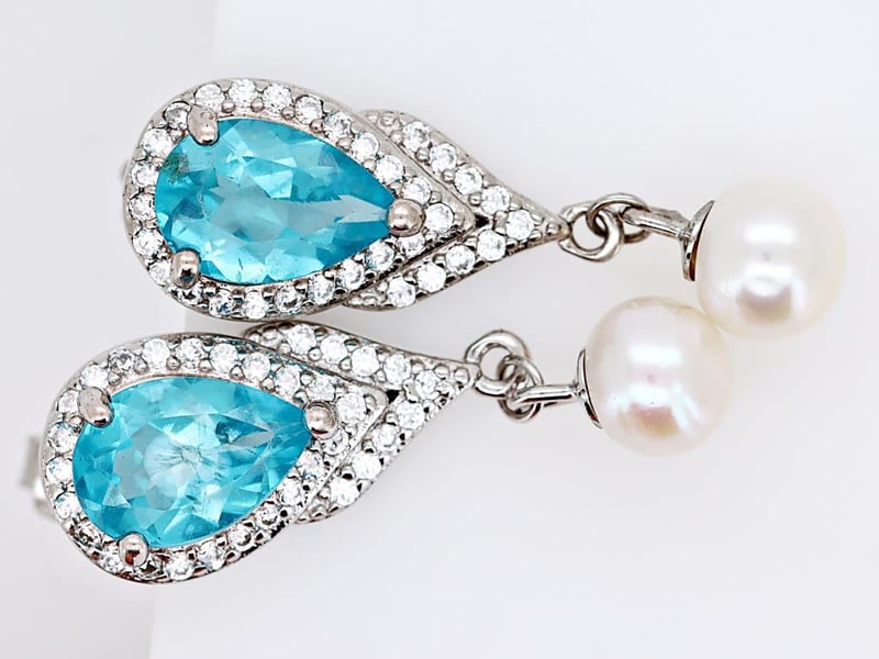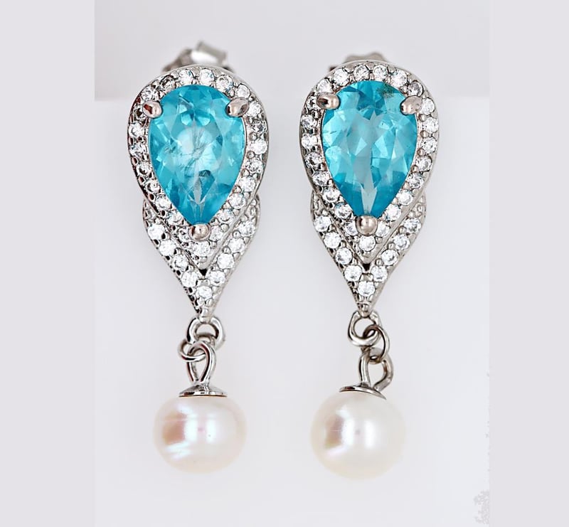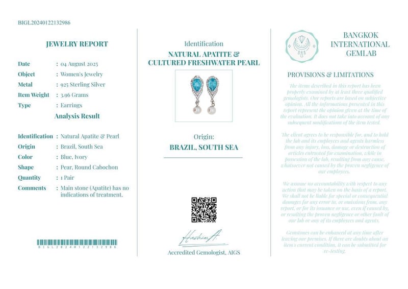 NATURAL APATITE & CULTURED FRESHWATER PEARL EARRINGS ON 925 SILVER - WITH CERTIFICATE Gemstone : Natural Apatite & Cultured Freshwater PearlCertificate Number : Bigl20240122132986Item Total Weight : 3.96 GramsMain Stone Color : Blue, IvorySize : Comments : Main Stone (Apatite) Has No Indications Of Treatment. ✻ Verify Report Online At Www.Bangkokinternationalgemlab.Co 0+34