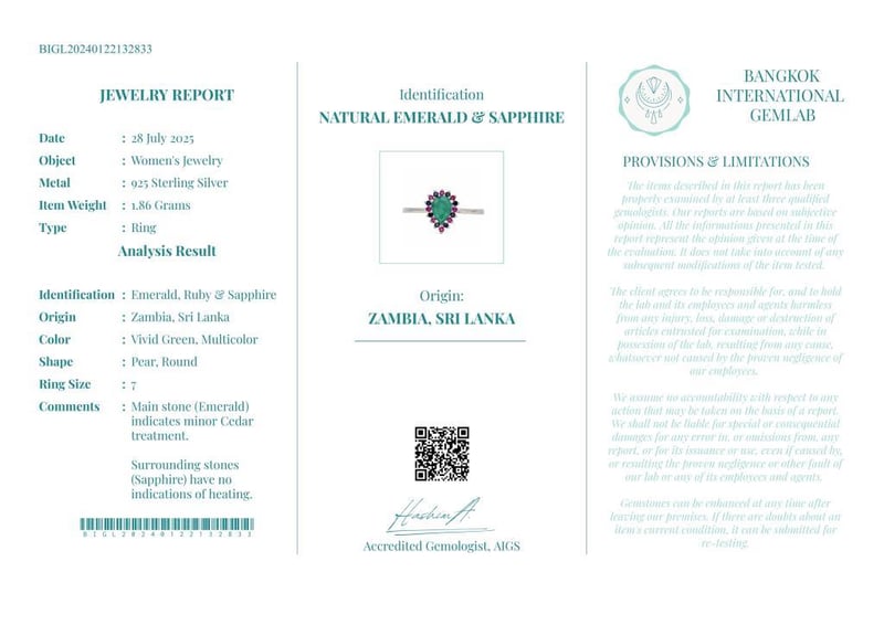 Comments : Main Stone (Emerald) Indicates Minor Cedar Treatment.
