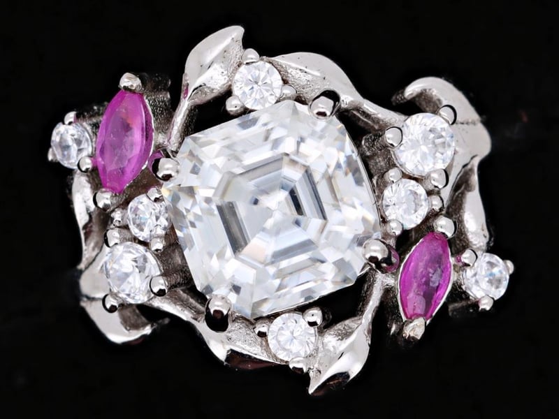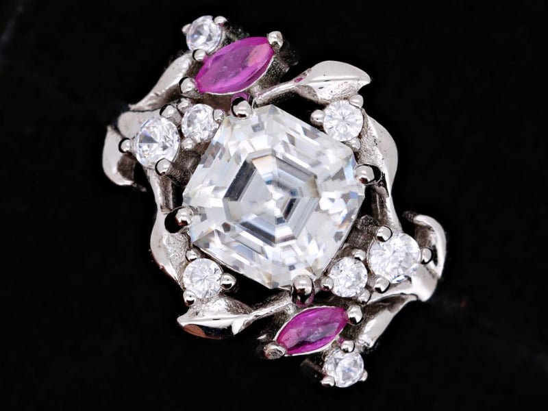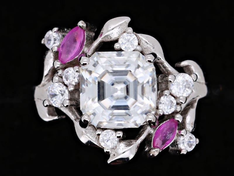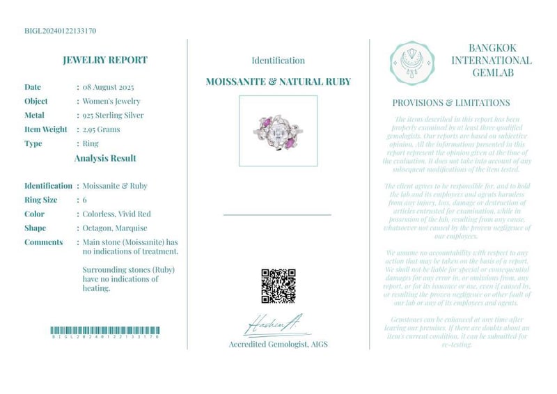 MOISSANITE & NATURAL BURMESE RUBY RING ON 925 SILVER - WITH CERTIFICATE Gemstone : Moissanite & Natural Burmese RubyCertificate Number : Bigl20240122133170Item Total Weight : 2.95 GramsMain Stone Color : Colorless, Vivid RedSize : 6Comments : Main Stone (Moissanite) Has No Indications Of Treatment.Surrounding Stones (Ruby) Have No Indications Of Heating. ✻ Verify Report Online At Www.Bangkokinternationalgemlab.Co 0+46