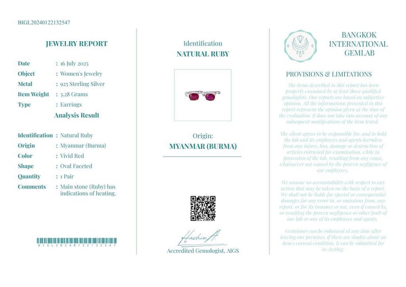NATURAL BURMESE RUBY EARRINGS ON 925 SILVER - WITH CERTIFICATE Gemstone : Natural Burmese RubyCertificate Number : Bigl20240122132547Item Total Weight : 3.28 GramsMain Stone Color : Vivid RedSize : Comments : Main Stone (Ruby) Has Indications Of Heating. ✻ Verify Report Online At Www.Bangkokinternationalgemlab.Co 0+5