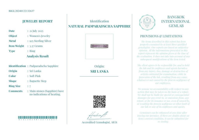 NATURAL PADPARADSCHA SAPPHIRE (UNHEATED) RING ON 925 SILVER - WITH CERTIFICATE Gemstone : Natural Padparadscha Sapphire (Unheated)Certificate Number : Bigl20240122132637Item Total Weight : 3.37 GramsMain Stone Color : Soft PinkSize : 7Comments : Main Stones (Sapphire) Have No Indications Of Heating. ✻ Verify Report Online At Www.Bangkokinternationalgemlab.Co 0+11
