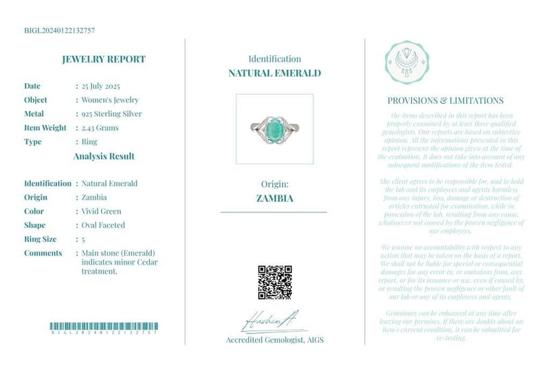 Comments : Main Stone (Emerald) Indicates Minor Cedar Treatment.