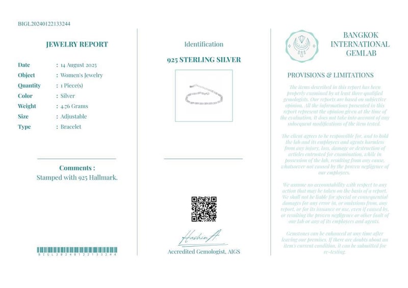 925 STERLING SILVER BRACELET - WITH CERTIFICATE Gemstone : 925 Sterling SilverCertificate Number : Bigl20240122133244Item Total Weight : 4.76 GramsMain Stone Color : SilverSize : AdjustableComments : Stamped With 925 Hallmark. ✻ Verify Report Online At Www.Bangkokinternationalgemlab.Co 0+51